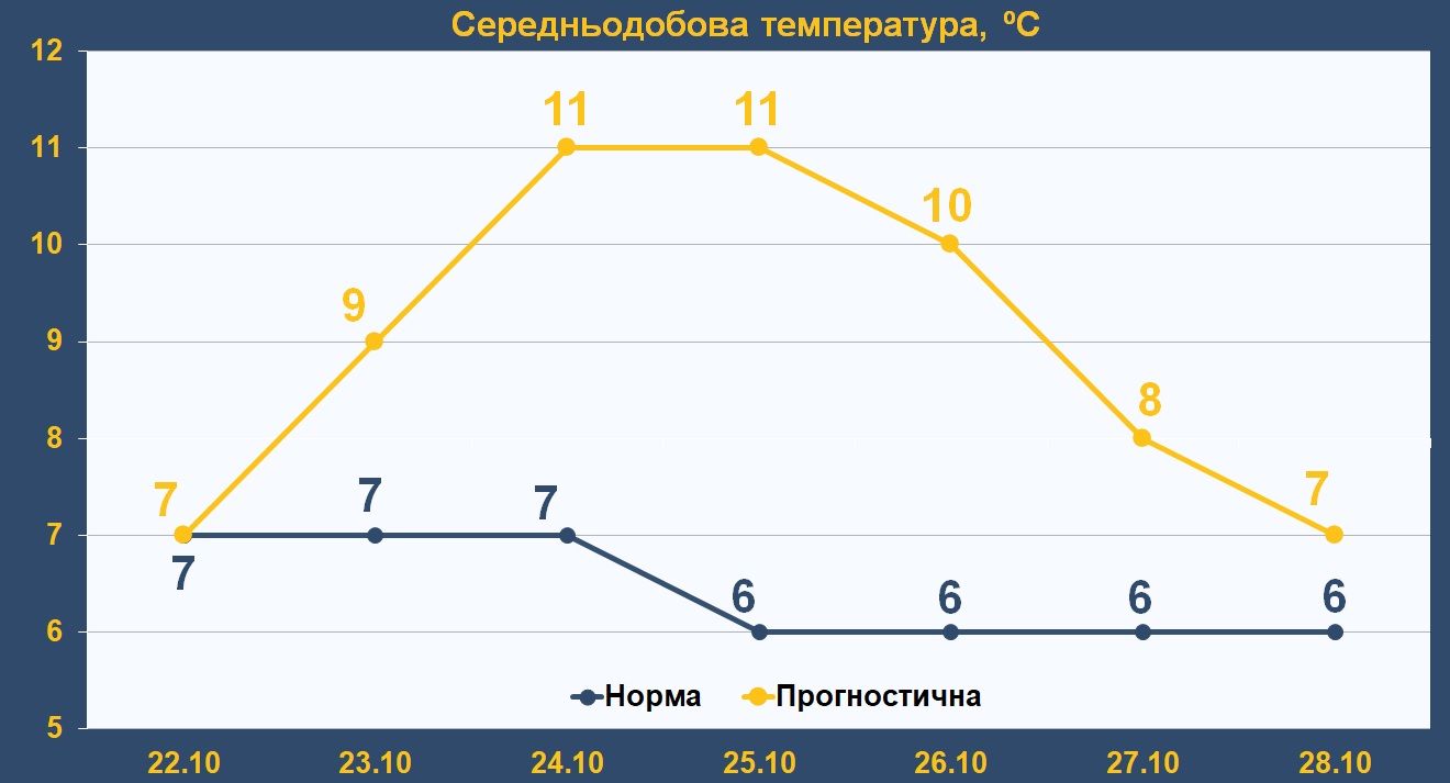 Погодна ситуація зміниться вже у п’ятницю та суботу, 24-25 жовтня. Небо знову затягнеться хмарами, прогнозуються періодичні дощі. Середня доба температура повітря підвищиться до 9-11° тепла, що перевищує кліматичну норму на 2-4°. Хоча це і вище норми, значного аномального тепла очікувати не варто, це буде радше помірне осіннє тепло.