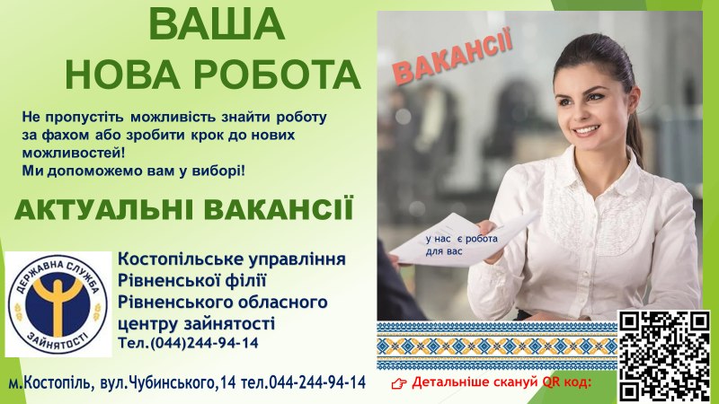 Костопільське управління Рівненської філії Рівненського обласного центру зайнятості запрошує на роботу фахівців у різних сферах. Обирайте вакансію, яка відповідає вашій кваліфікації!