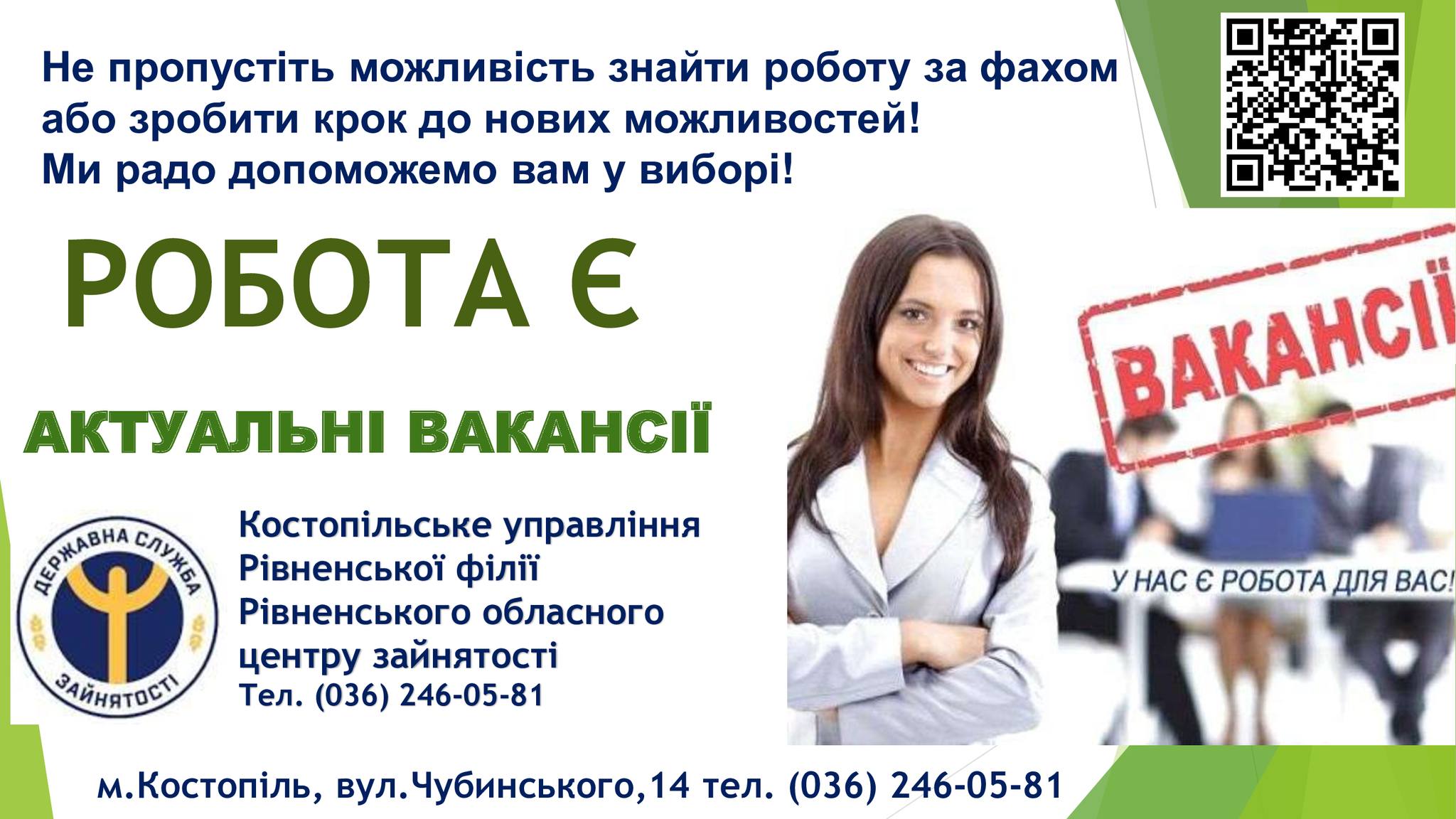 ✨ Чекаємо на вас у Костопільському управлінні Рівненської філії Рівненського обласного центру зайнятості! Не пропустіть можливість знайти роботу за фахом або зробити крок до нових кар’єрних можливостей! Ми допоможемо вам у виборі! 👉 Збережіть цей пост і поділіться з друзями, які шукають роботу! ❤️