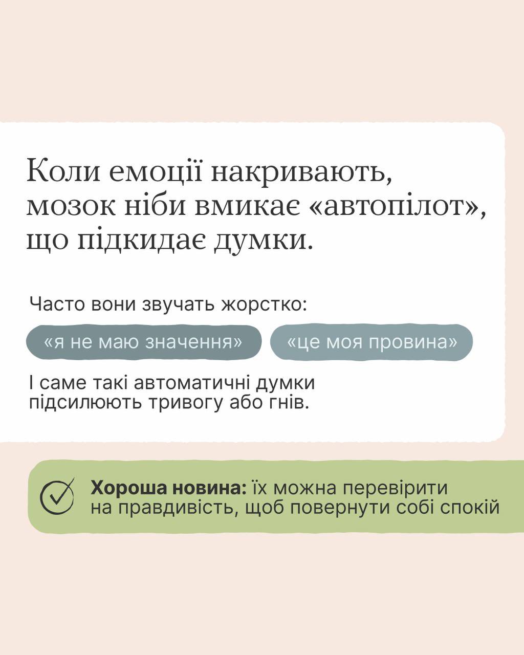 1. **Ідентифікуйте думку:** Зверніть увагу на свої емоції. Яка думка їх викликала?