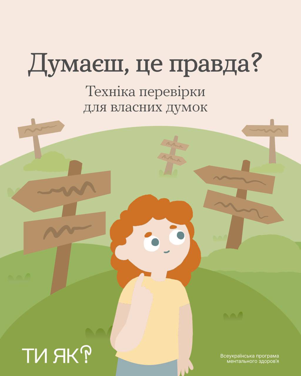 Чи завжди ваші думки відповідають дійсності? Навчіться перевіряти їх за допомогою експертів Всеукраїнської програми з ментального здоров’я «Ти як?». У каруселі ви знайдете дієві методи, як аналізувати власні автоматичні думки. Вони часто виникають несвідомо, можуть бути неправдивими та провокувати негативні емоції. Освоєння навичок аналізу таких думок дозволяє зрозуміти, що вони не визначають вашу особистість і не керують вашими діями.