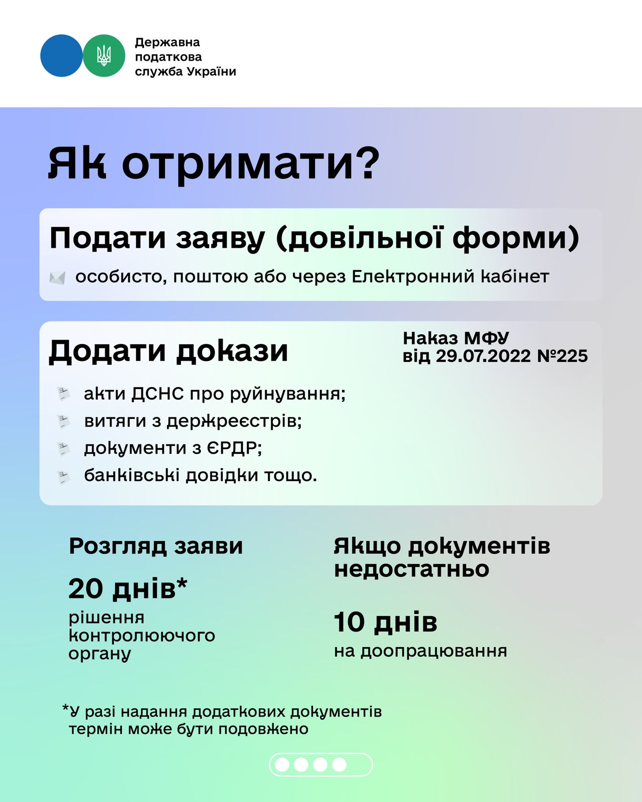 Для отримання податкових пільг платник податків повинен подати до контролюючого органу заяву у довільній формі. До заяви необхідно додати підтверджуючі документи, які можуть включати: