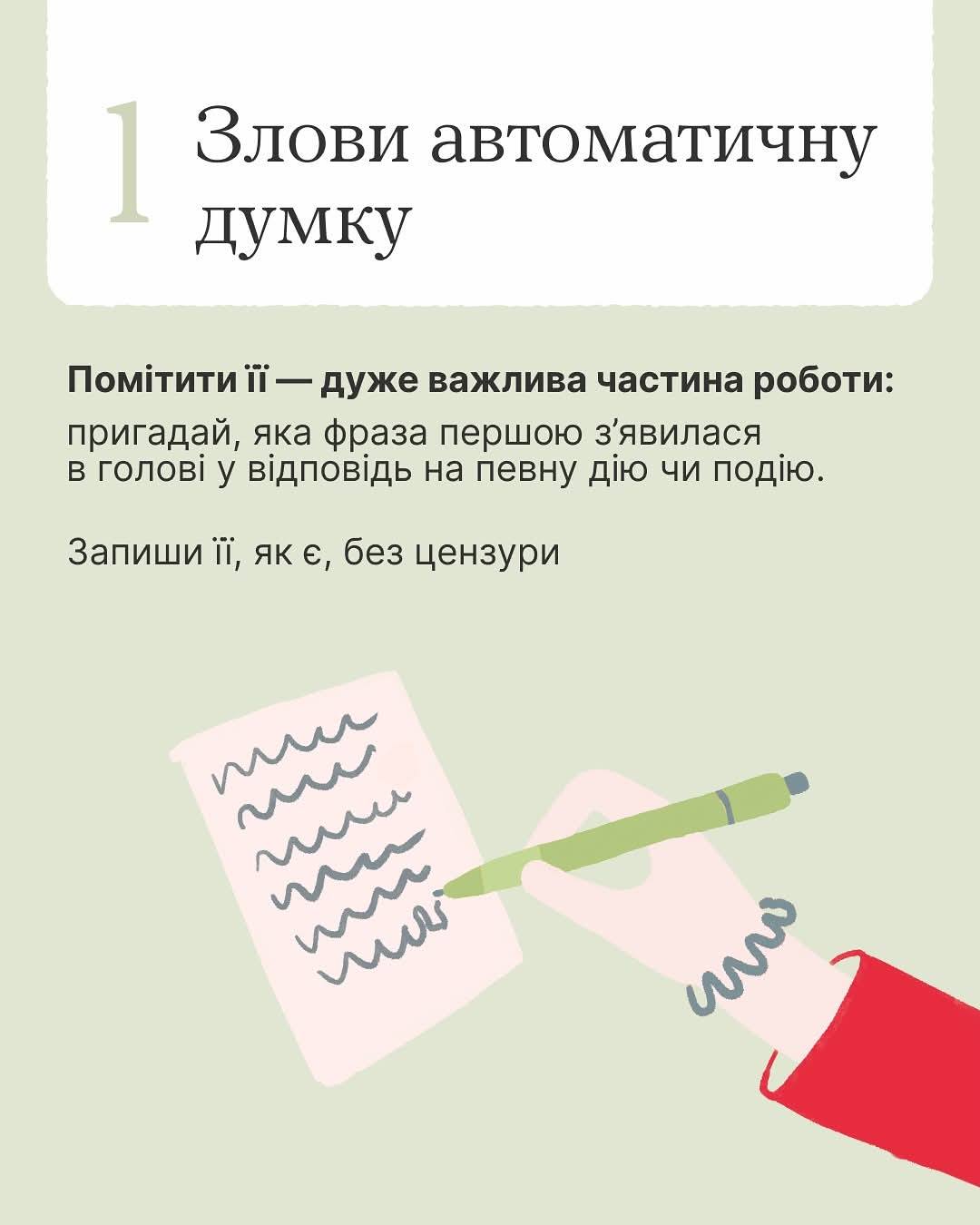- Ідентифікувати негативні думки: навчіться помічати, коли з’являється тривожна чи самокритична думка.