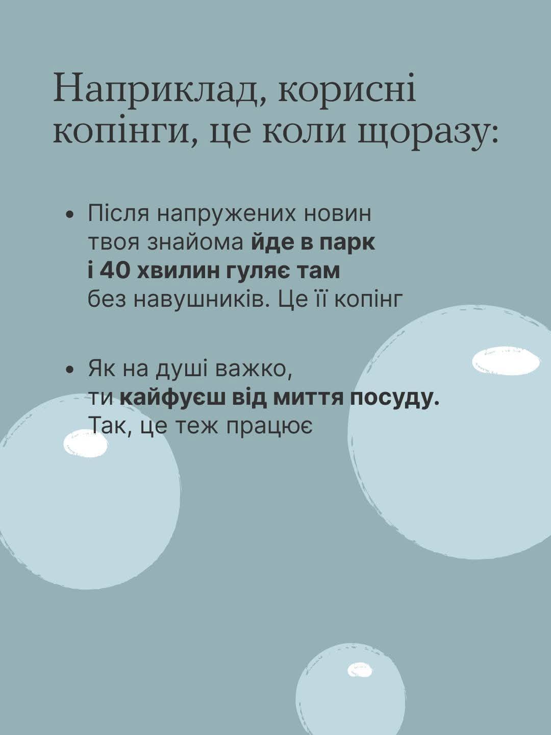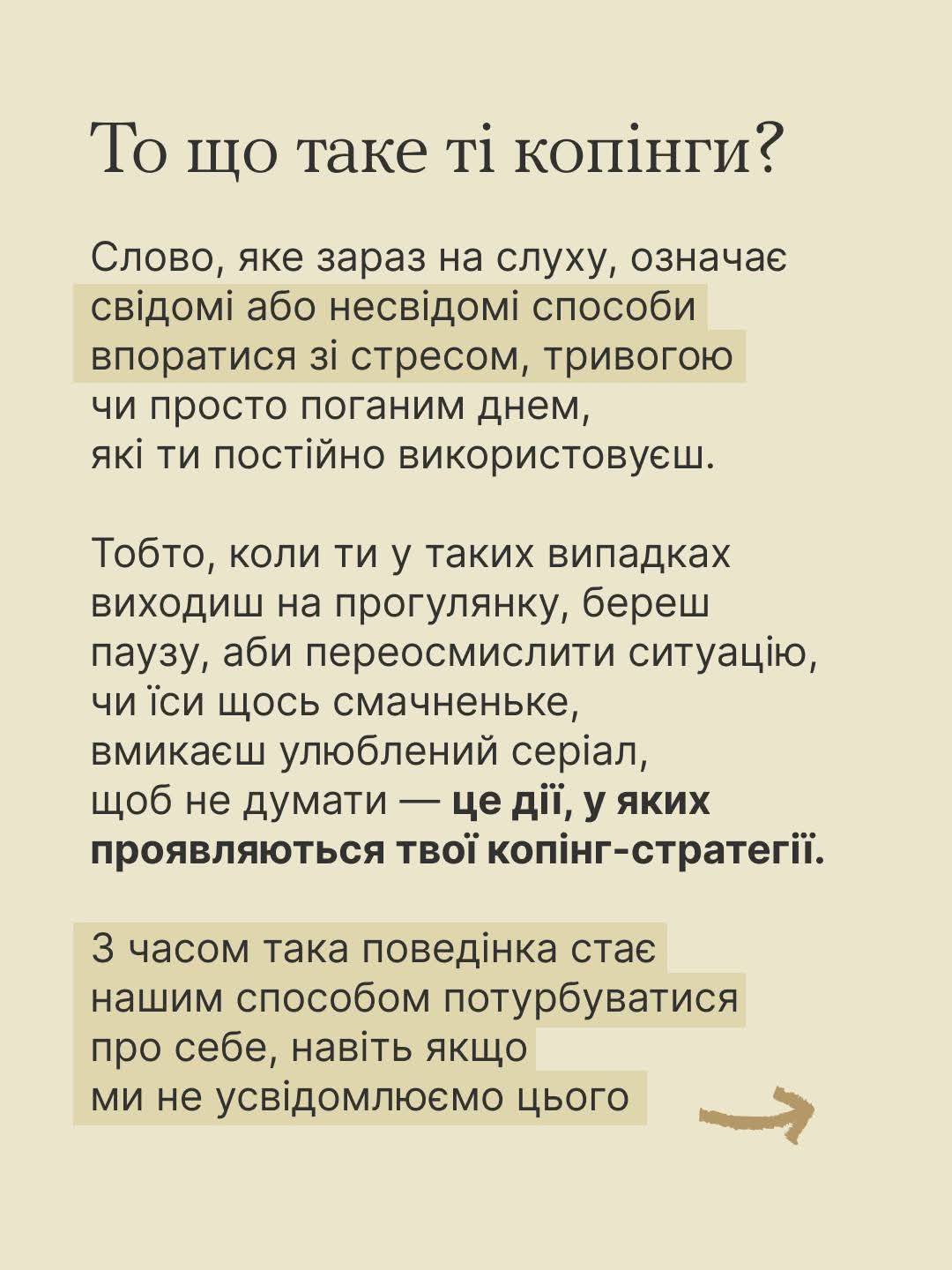 Важливо розуміти, що не всі копінги є однаково корисними. Деякі можуть здаватися ефективними на перший погляд, але в довгостроковій перспективі лише погіршують стан. Наприклад, уникнення проблем або повне занурення в роботу без відпочинку можуть призвести до вигорання та посилення тривоги.
