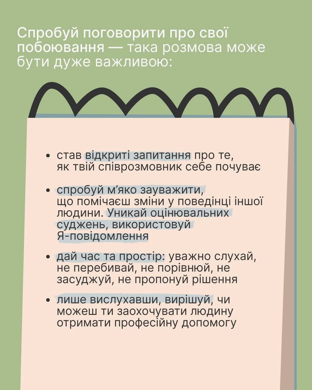 Просто будь поруч та підтримуй. А щоб підготуватися до важливої розмови про ментальне здоров’я, дивись поради в каруселі 👉