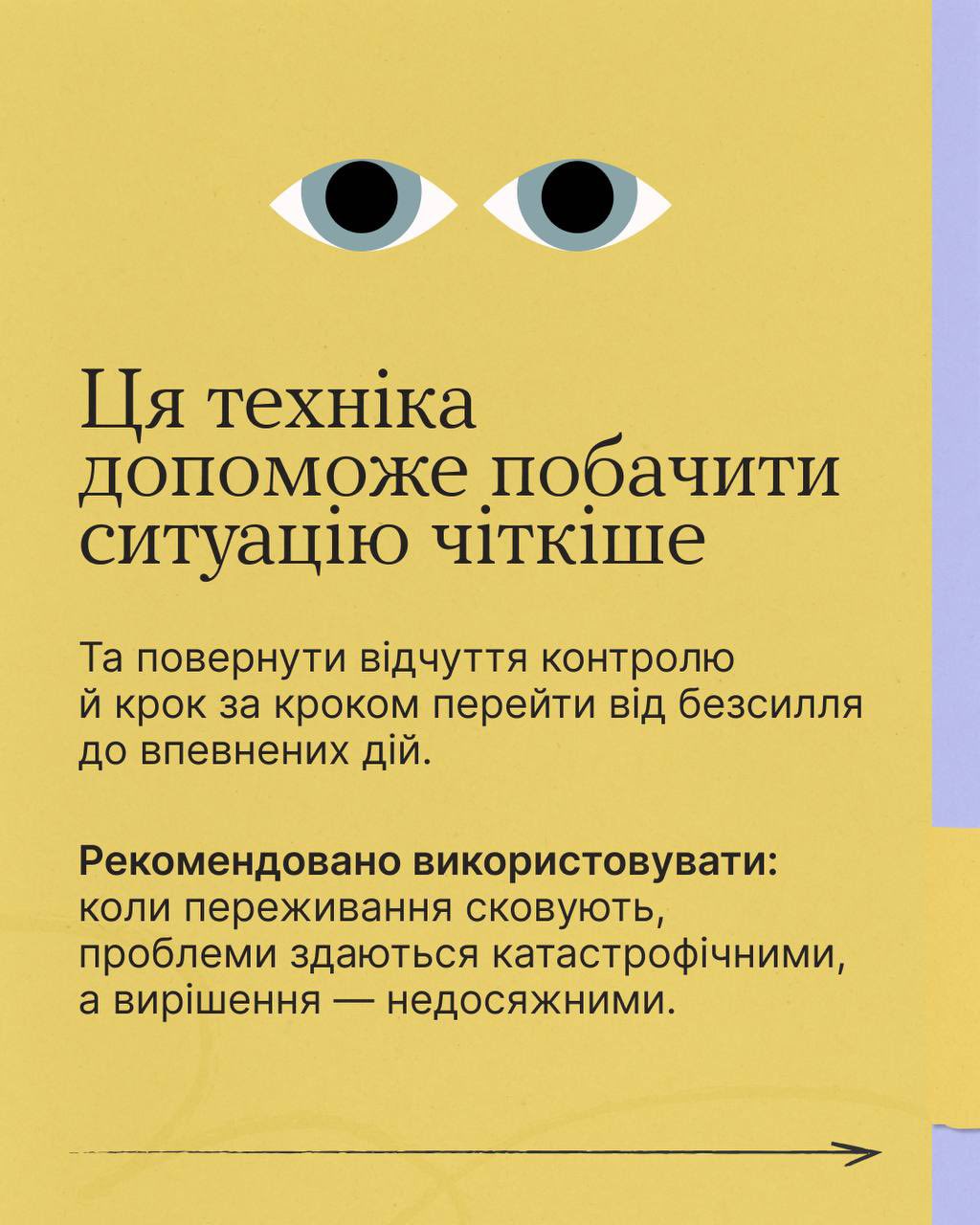 У каруселі представлені кроки, які допоможуть вам стабілізувати свій емоційний стан. Вони розроблені таким чином, щоб бути максимально доступними та легкими для виконання, навіть у стані сильного стресу. Ключова мета цих технік — повернути вам відчуття контролю над ситуацією та власною реакцією.