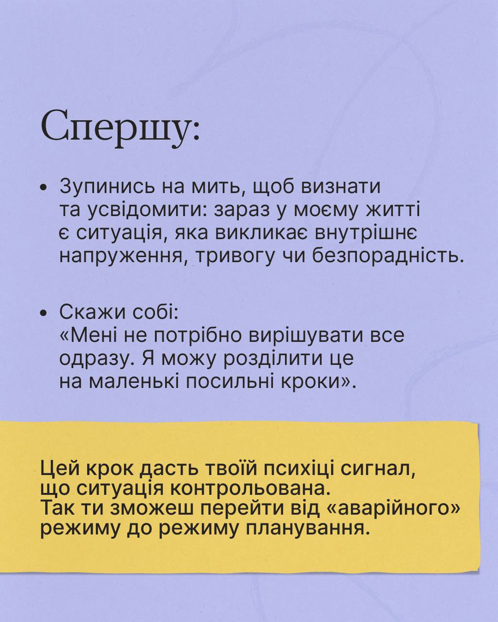 Коли відчуття тривоги стає нестерпним і паралізує, виникає потреба в чіткому алгоритмі дій, щоб зрушити з місця та почати діяти. Саме для таких моментів експерти Всеукраїнської програми ментального здоров’я «Ти як?» розробили простий план, який допоможе повернути відчуття контролю та впевненості у власних силах.