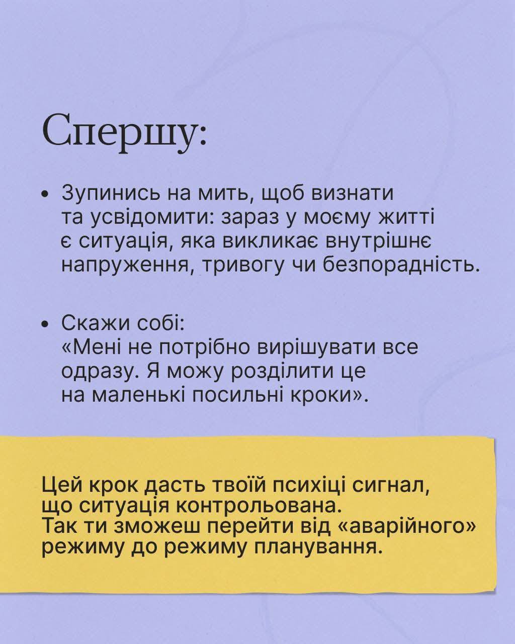 Коли відчуття тривоги стає настільки сильним, що унеможливлює вирішення повсякденних завдань, виникає нагальна потреба у чіткому алгоритмі дій. Цей алгоритм допоможе зрушити з мертвої точки та повернути контроль над своїм станом. Прості кроки, розроблені експертами Всеукраїнської програми ментального здоров’я «Ти як?», допоможуть вам повернути відчуття контролю та впевненості у власних силах. Ця програма пропонує ефективні техніки підтримки та самодопомоги, які можуть бути доступні кожному.