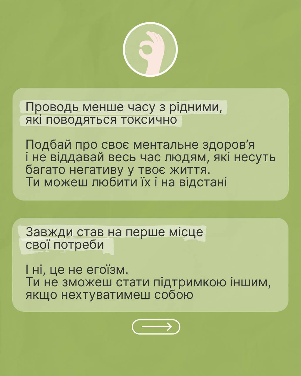 У каруселі, представленій експертами Всеукраїнської програми «Ти як?», зібрано основні правила «розмежування» в сім’ї, що допоможуть вам зберегти власні кордони. Ці поради не спрямовані на те, щоб посварити вас з родичами, віддалити від них або довести близьким те, що вони не можуть зрозуміти. Пам’ятайте: ви – найважливіша людина у власному житті.
