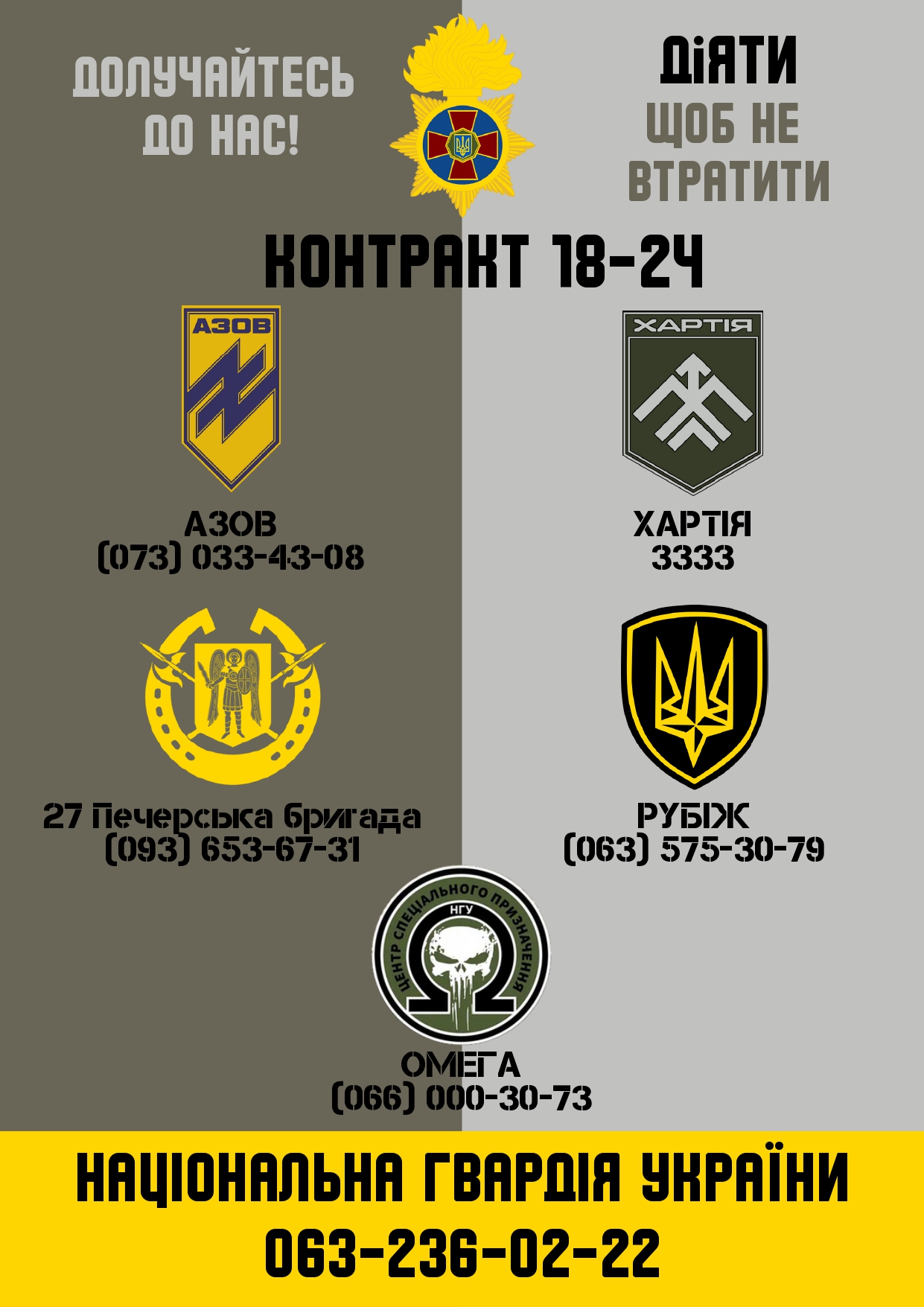 Шукаєте можливість служити Україні та отримати стабільний дохід? Національна гвардія України оголошує набір молодих людей віком від 18 до 24 років для проходження служби за контрактом. Це ваш шанс стати частиною еліти українського війська, внести свій вагомий внесок у захист суверенітету та територіальної цілісності нашої держави. Ми пропонуємо контракт терміном на 1 рік, що дозволить вам отримати цінний досвід та визначитися з подальшою військовою кар’єрою. Особливо привабливою є одноразова виплата у розмірі 1 000 000 гривень за підписання контракту. Це значна фінансова підтримка, яка допоможе вам на початку вашого шляху у війську. Приєднуючись до Національної гвардії, ви не просто отримуєте роботу, а стаєте частиною великої родини, де панують честь, мужність та взаємодопомога. Наші підрозділи оснащені сучасною технікою, а умови служби відповідають найвищим стандартам. Ми дбаємо про своїх бійців, забезпечуючи їм гідне грошове утримання, соціальні гарантії та можливості для професійного зростання. Якщо ви готові до викликів, прагнете захищати свою Батьківщину та будувати успішну кар’єру, Національна гвардія України – це ваш вибір. Це унікальна можливість заявити про себе, показати свою силу духу та причетність до великої справи – захисту України. Не проґавте свій шанс стати легендою! Телефонуйте для отримання детальної інформації: 063-236-02-22.