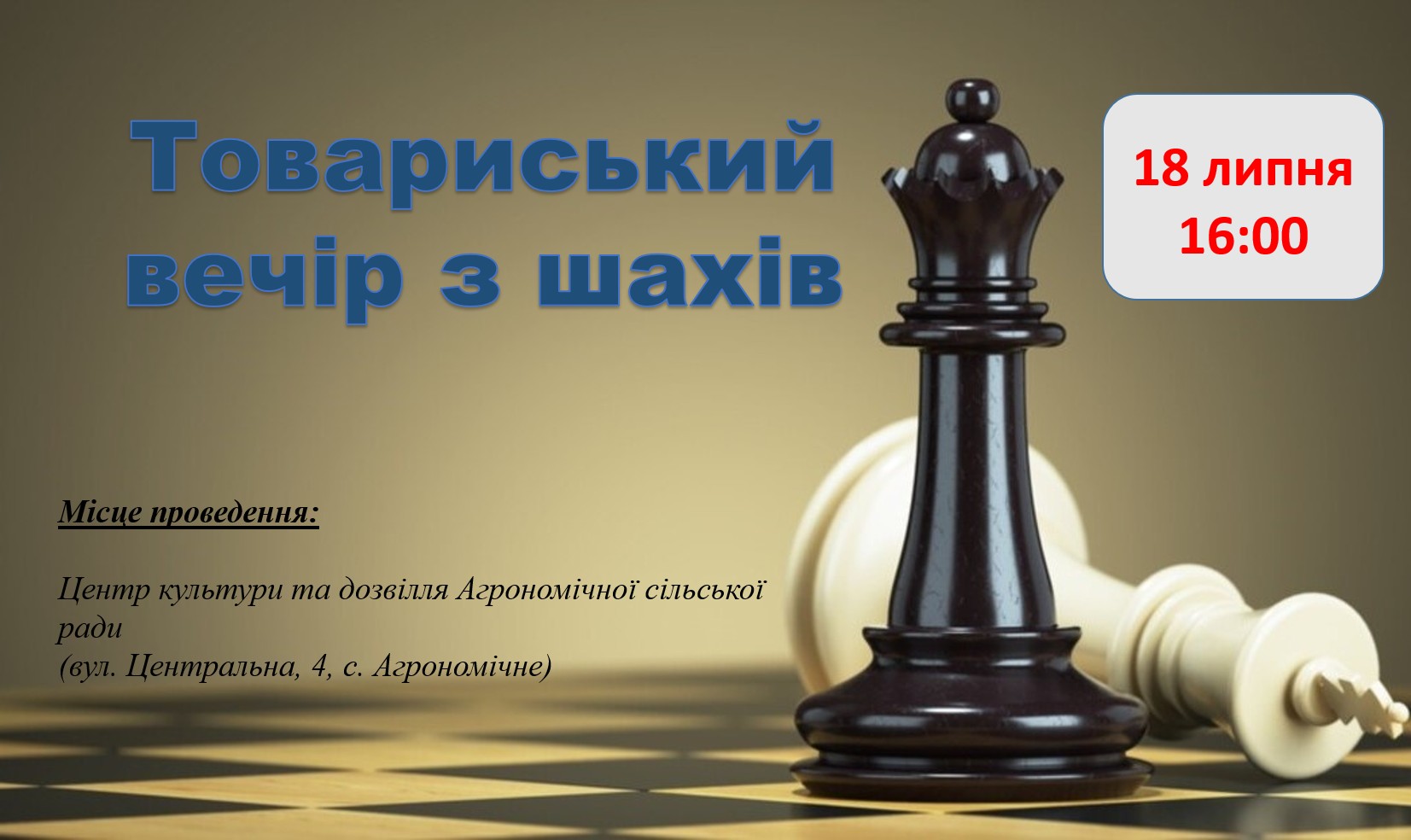 З нагоди Міжнародного дня шахів, запрошуємо вас приєднатись до нашого товариського вечора з шахів, який відбудеться в п’ятницю, 18 липня, о 16:00 в Центрі культури та дозвілля Агрономічної сільської ради (адреса: вул. Центральна, 4).