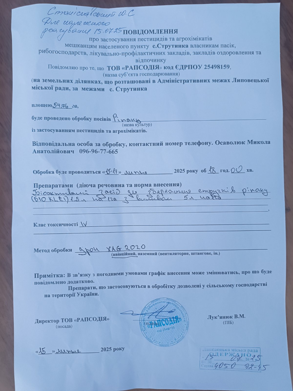 ТОВ “Рапсодія” проводитиме обробіток посівів ріпаку протягом 15-17 липня 2025 року на полях поблизу с. Струтинка. Відповідальна особа агропідприємства Осаволюк Микола Анатолійович, контактний телефон: +380969677665.