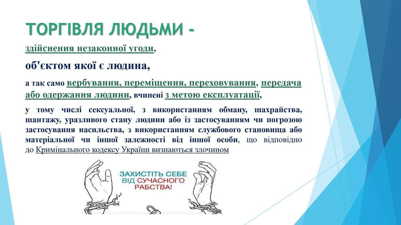 📍❗️Проблема торгівлі людьми є однією з найгостріших глобальних викликів, яка у мирний час вже становила серйозну загрозу, а в умовах повномасштабної збройної агресії та вимушеного переселення набуває катастрофічних масштабів. Сучасне рабство процвітає там, де панує вразливість, і, на жаль, війна створює ідеальне середовище для процвітання цього злочинного бізнесу. Наразі питання протидії торгівлі людьми є вкрай актуальним для кожного українця. Ризик потрапити в ситуацію торгівлі людьми стосується як тих, хто шукає прихистку за кордоном, так і тих, хто залишається в Україні, особливо у прифронтових та постраждалих регіонах. Особливо вразливими категоріями є діти, молодь та підлітки, які через брак інформації або відчай можуть стати легкою мішенню для експлуататорів.У пошуках заробітку, особливо сезонного, діти та молодь можуть стикатися з надзвичайно привабливими, але абсолютно неперевіреними пропозиціями, які обіцяють високу оплату. Ці пропозиції часто надходять від так званих “представників” модельних агенцій або недобросовісних “роботодавців”, що пропонують легкий «онлайн-заробіток», «оплату за фотографії» чи участь у «прямих ефірах». За цими привабливими фасадами часто приховується підступна мета – схилити неповнолітніх до створення матеріалів або вчинення дій сексуального характеру, що є однією з форм торгівлі людьми. Зйомки порнографічного контенту можуть відбуватися таємно, з використанням психологічного тиску, фізичного насильства, шантажу, прямого примусу або ж маніпуляції вразливим станом жертв, які часто навіть не усвідомлюють повною мірою наслідків такої жахливої експлуатації. Крім того, злочинці можуть цілеспрямовано обмежувати вашу свободу пересування та зв’язок із зовнішнім світом, що є ознакою сучасного рабства, втягуючи жертв у проституцію, примусову працю або інші форми злочинної діяльності. Захист від шахрайства та кіберзлочинності в інтернеті стає життєво необхідним.❗️❗️❗️Важливо запам’ятати: торгівля людьми не завжди проявляється у прямому насильстві чи відкритих погрозах. Часто злочинці використовують більш витончені методи, маніпулюючи довірою, зловживаючи владою або користуючись вразливим становищем людини – її фінансовими труднощами, незнанням мови, відсутністю підтримки. Це може бути обман із працевлаштуванням, примусова праця, боргова кабала. Саме тому необхідно бути надзвичайно пильними і критично оцінювати будь-які сумнівні пропозиції швидкого заробітку, особливо ті, що виглядають занадто привабливими. Протидія торгівлі людьми починається з обізнаності. ☝️Завжди перевіряйте інформацію, шукайте відгуки про роботодавців, не передавайте свої документи незнайомцям і обов’язково повідомляйте рідним про свої плани. Батькам вкрай важливо вести відкритий діалог з дітьми щодо ризиків в інтернеті та небезпек онлайн-шахрайства, щоб забезпечити їхню безпеку онлайн. Це допоможе сформувати у дітей розуміння безпечної міграції та цифрової гігієни. Знання про гарячі лінії допомоги є першим кроком до захисту.☎️Якщо ви потребуєте допомоги, або ви знаєте кому потрібна допомога – є цілодобовий та безкоштовний телефон гарячої лінії з протидії торгівлі людьми та домашньому насильству – 15 47Також:0 800 500 202/102 гаряча лінія Національної поліції України0 800 213 103 контакт-це