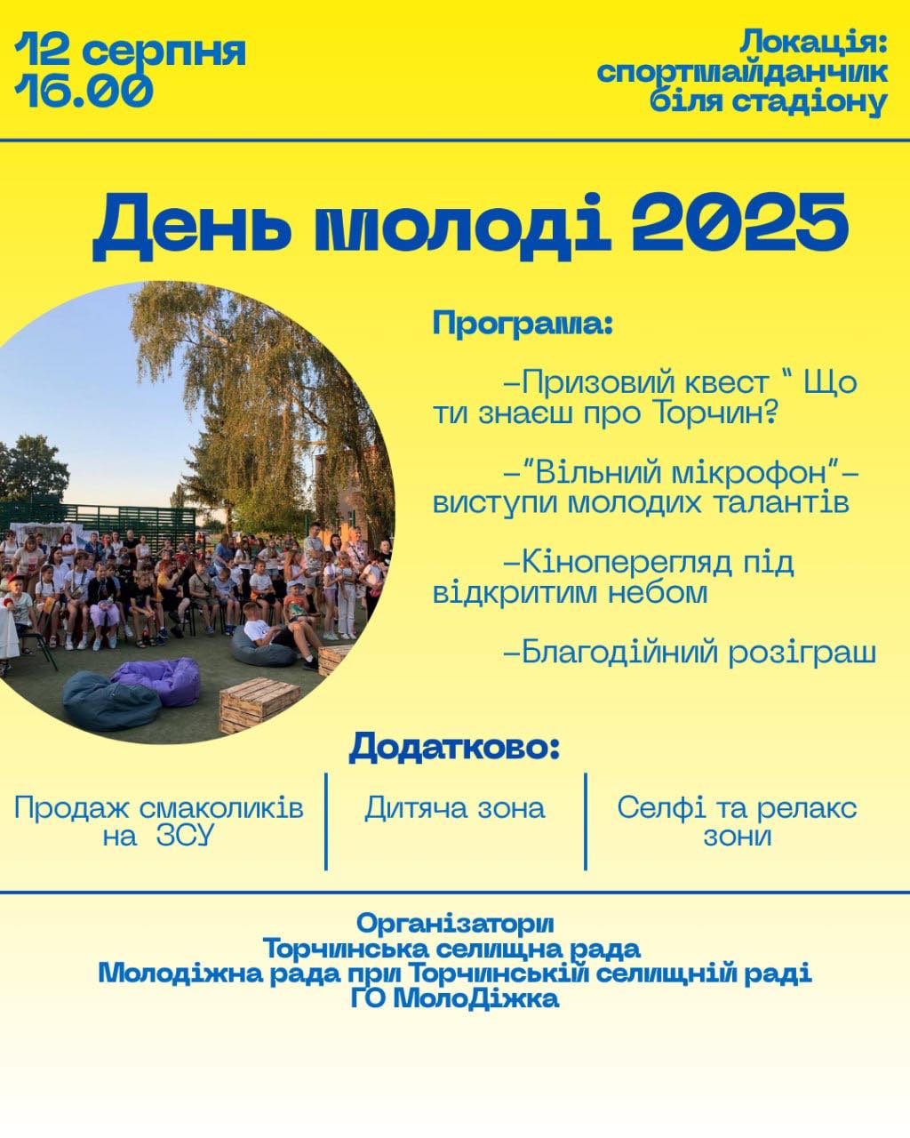 Торчинська селищна рада спільно з Молодіжна рада при Торчинській селищній раді та ГО”Молодіжка” запрошують усіх бажаючих на відзначення Міжнародного дня молоді у вівторок 12 серпня о 16:00 год на території спортивного майданчика біля стадіону селища Торчин, де відбудуться наступні активності: