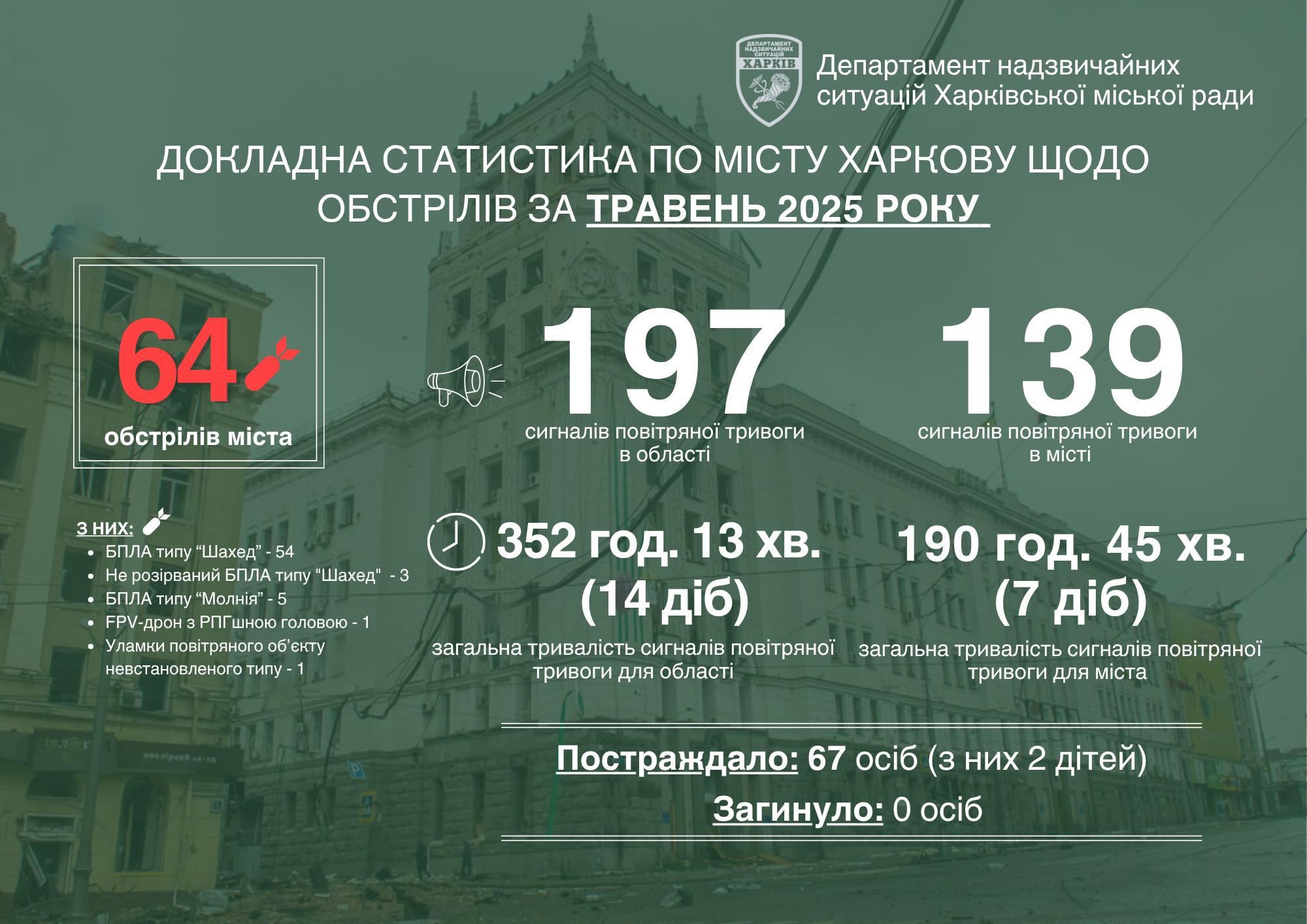 Внаслідок цих обстрілів 67 мешканців Харкова отримали поранення, серед яких, на жаль, двоє дітей. Можна вважати великим щастям, що в травні обійшлося без загиблих. Проте, кожен обстріл несе потенційну загрозу для життя та здоров’я людей.