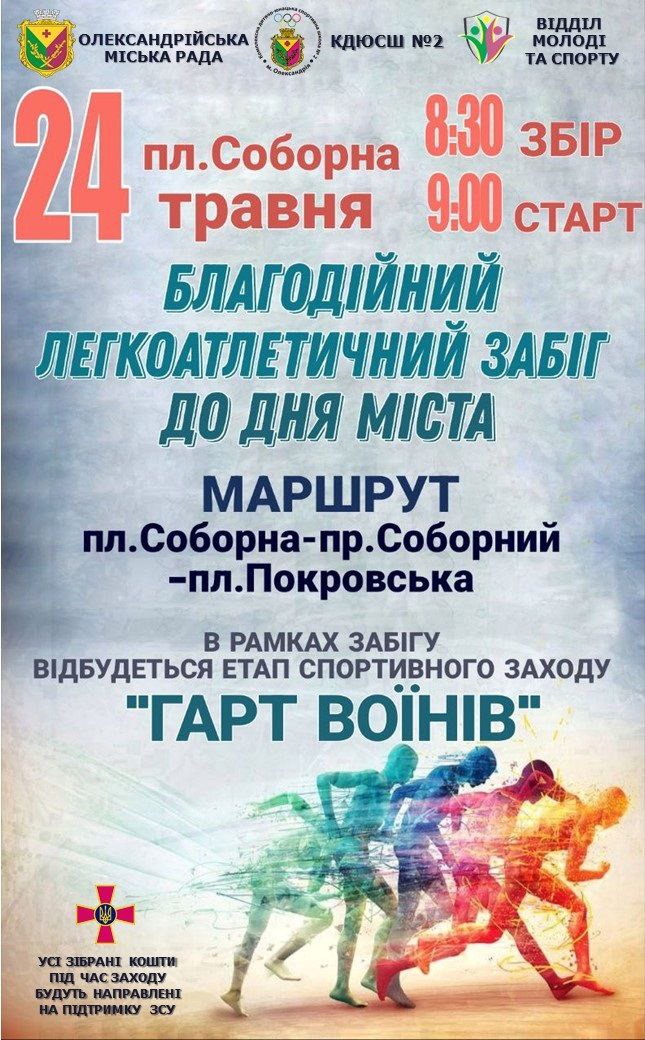 Легкоатлетичний забіг в Олександрії відбудеться вже 24 травня! Не пропустіть цю чудову можливість активно та весело провести час, підтримати спортивний дух міста та долучитися до благодійної ініціативи.