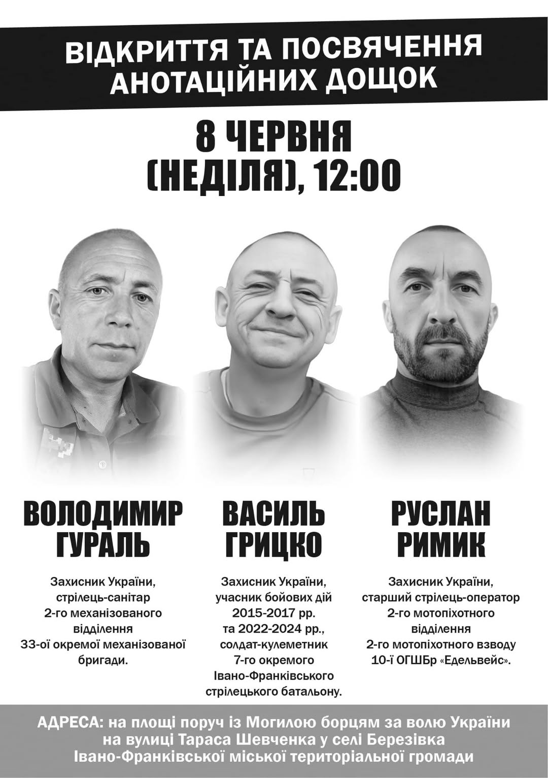 🕊️ У неділю, 8 червня, в селі Березівка, що входить до Івано-Франківської міської територіальної громади, відбудеться урочисте відкриття та освячення анотаційних дошок на честь: