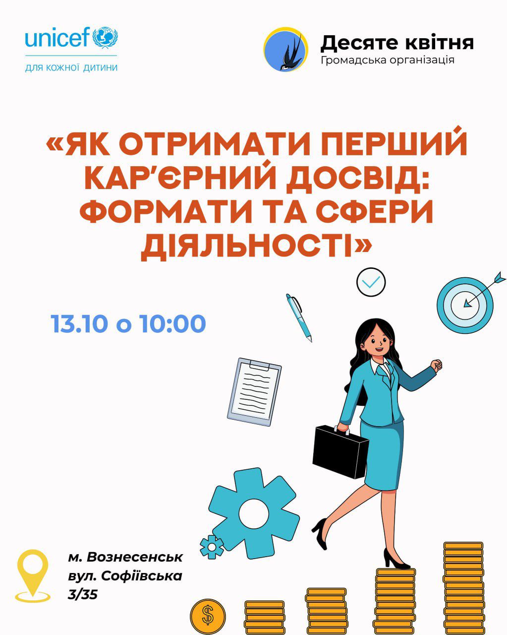 Запрошуємо молодь віком від 14 до 24 років взяти участь у захоплюючому тренінгу з розвитку кар’єрних навичок на тему «Як отримати перший кар’єрний досвід: формати та сфери діяльності». Цей захід – чудова нагода зробити впевнений крок у професійне майбутнє та отримати цінні знання, які допоможуть вам зорієнтуватися на ринку праці.