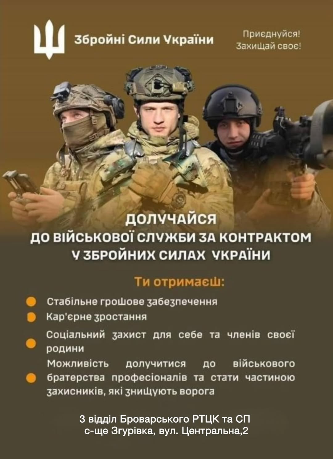 Дізнатися більше про всі переваги та умови військової служби за контрактом, а також пройти необхідні консультації, ви можете у 3-му відділі Броварського РТЦК та СП. Ми розташовані за адресою: селище Згурівка, вулиця Центральна, 2. Не втрачайте свій шанс стати частиною нашої команди. Для отримання додаткової інформації телефонуйте: 095-914-28-48.