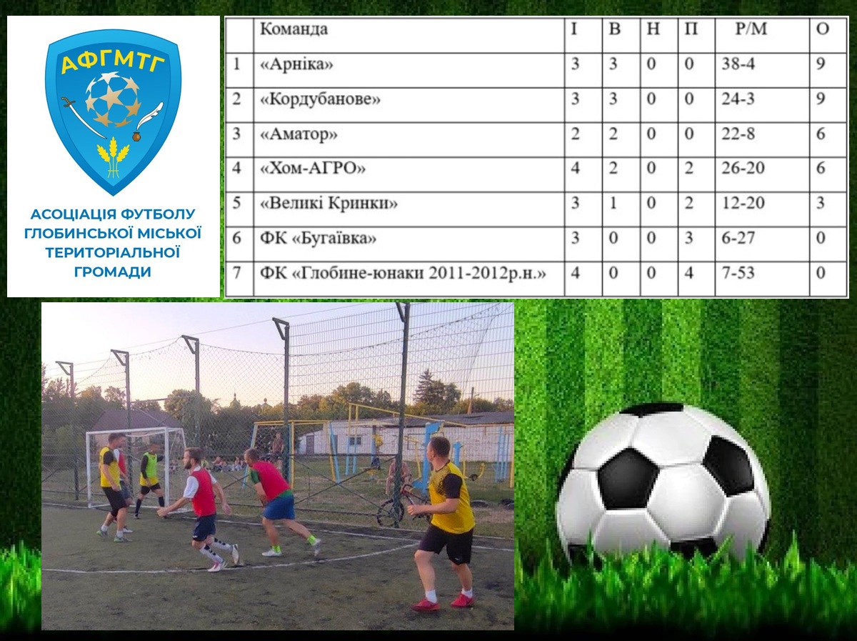 ⚽️Триває відкрита першість Глобинської громади з міні-футболу серед дорослих команд, в якій беруть участь сім команд: «Арніка», «Кордубанове», Великі Кринки», «Хом-АГРО» (Семенівська ТГ), «Аматор», ФК «Бугаївка» (Градизька ТГ) та ФК «Глобине-юнаки 2011-2012 р.н.).