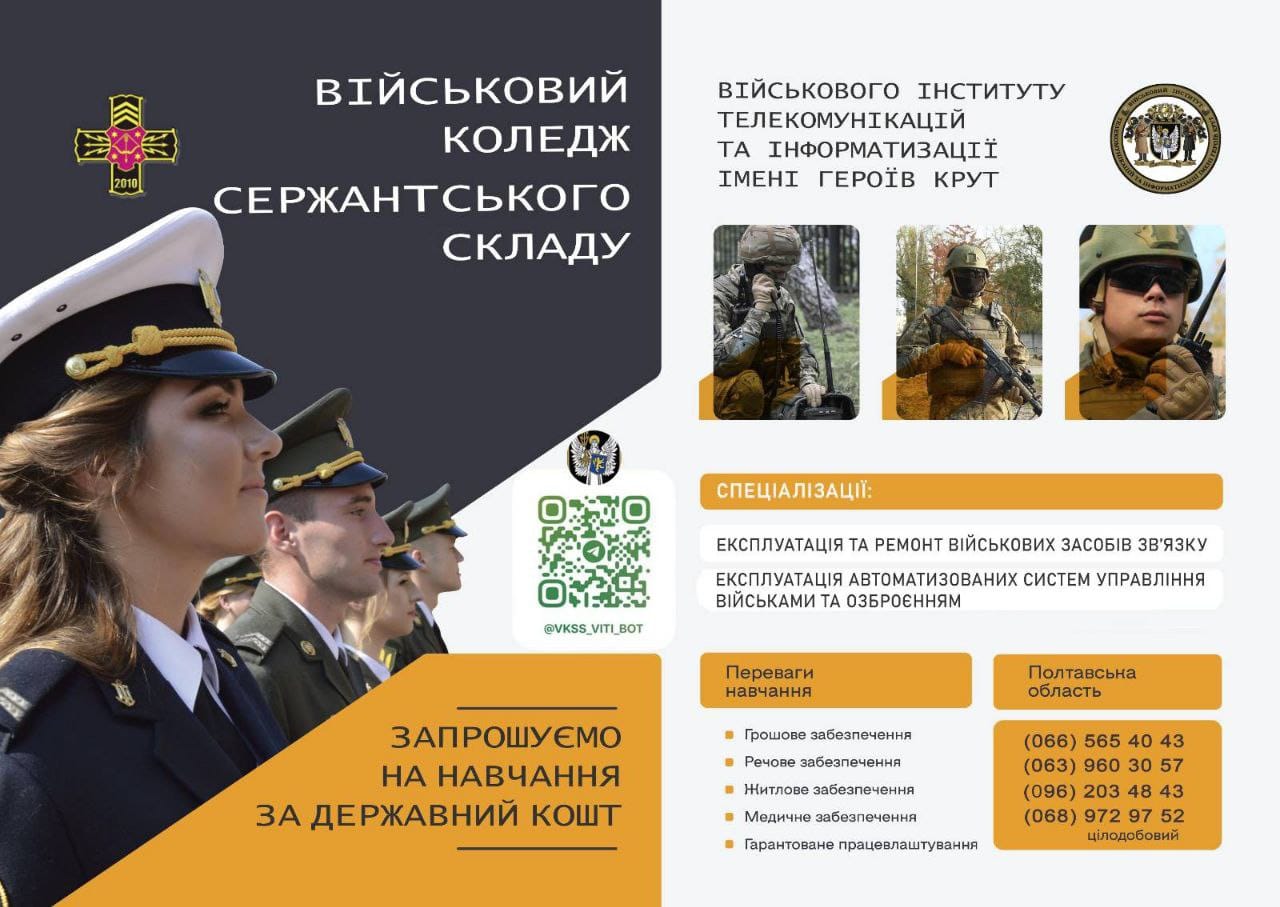 🎓 Стартував 3-й тур вступної кампанії до Військового коледжу сержантського складу у Полтаві! Цей навчальний заклад, що є частиною Військового інституту телекомунікації та інформатизації імені Героїв Крут, запрошує абітурієнтів до вступу.