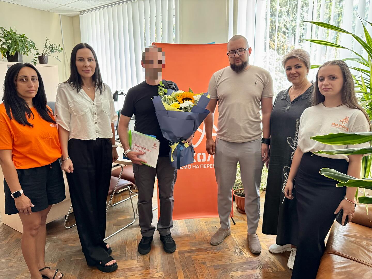 Зворушлива зустріч відбулася у департаменті соціальної та ветеранської політики Кам’янської міської ради. За дорученням міського голови Андрія Білоусова Захисника привітали заступник міського голови з питань діяльності виконавчих органів міської ради, керуючий справами виконавчого комітету Кам’янської міської ради Світлана Колісніченко, директор департаменту соціальної та ветеранської політики Кам’янської міської ради Людмила Кравчук та представник ГО «Бджола» Дмитро Гайдук.