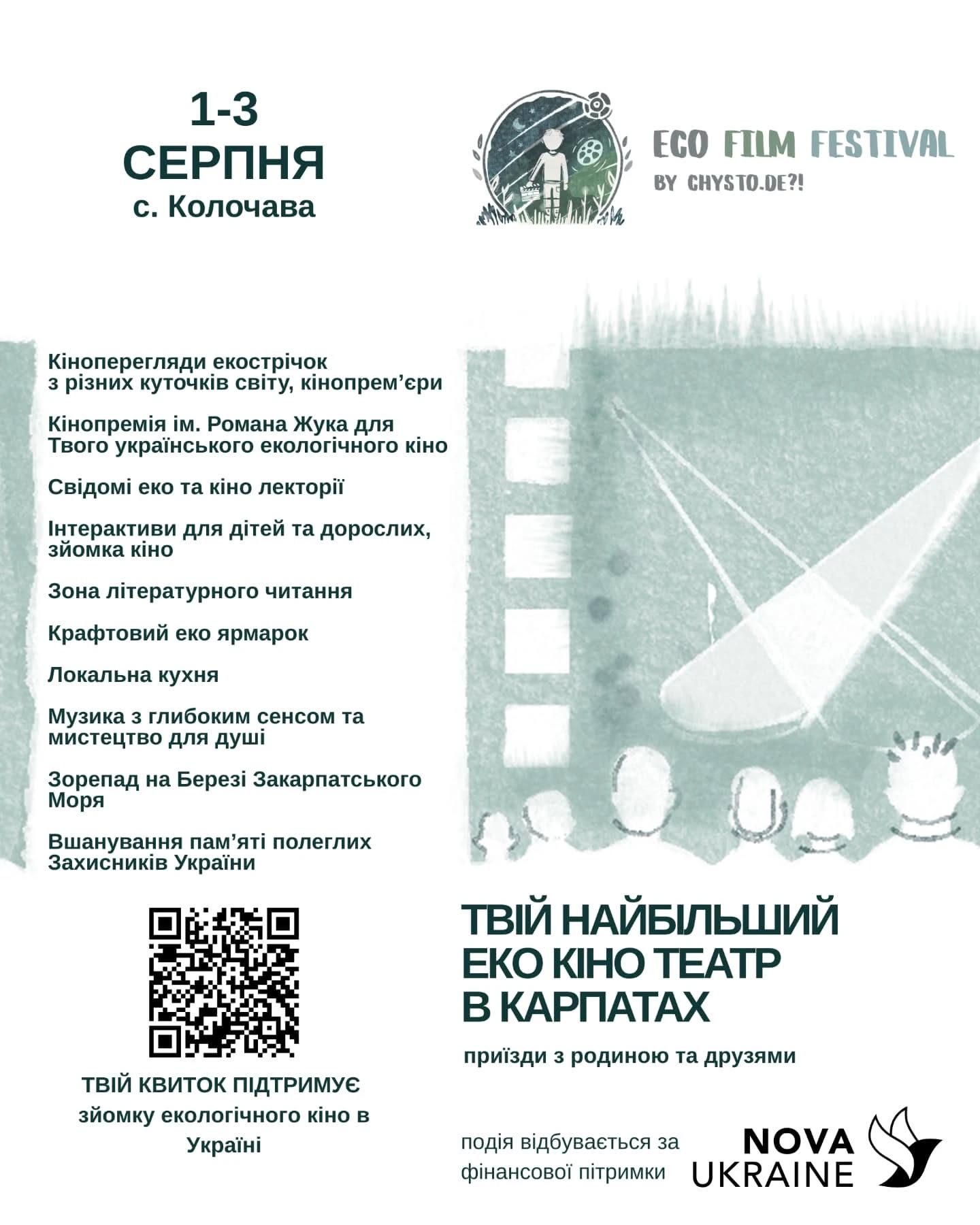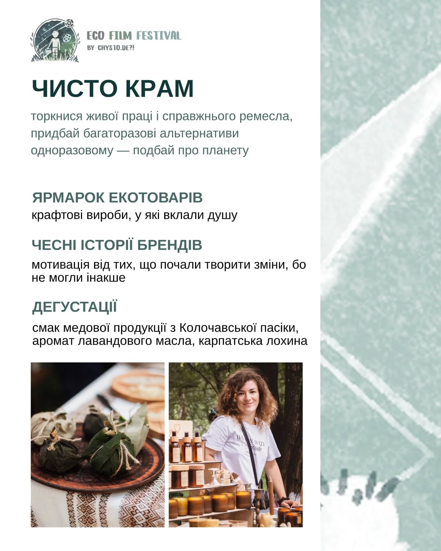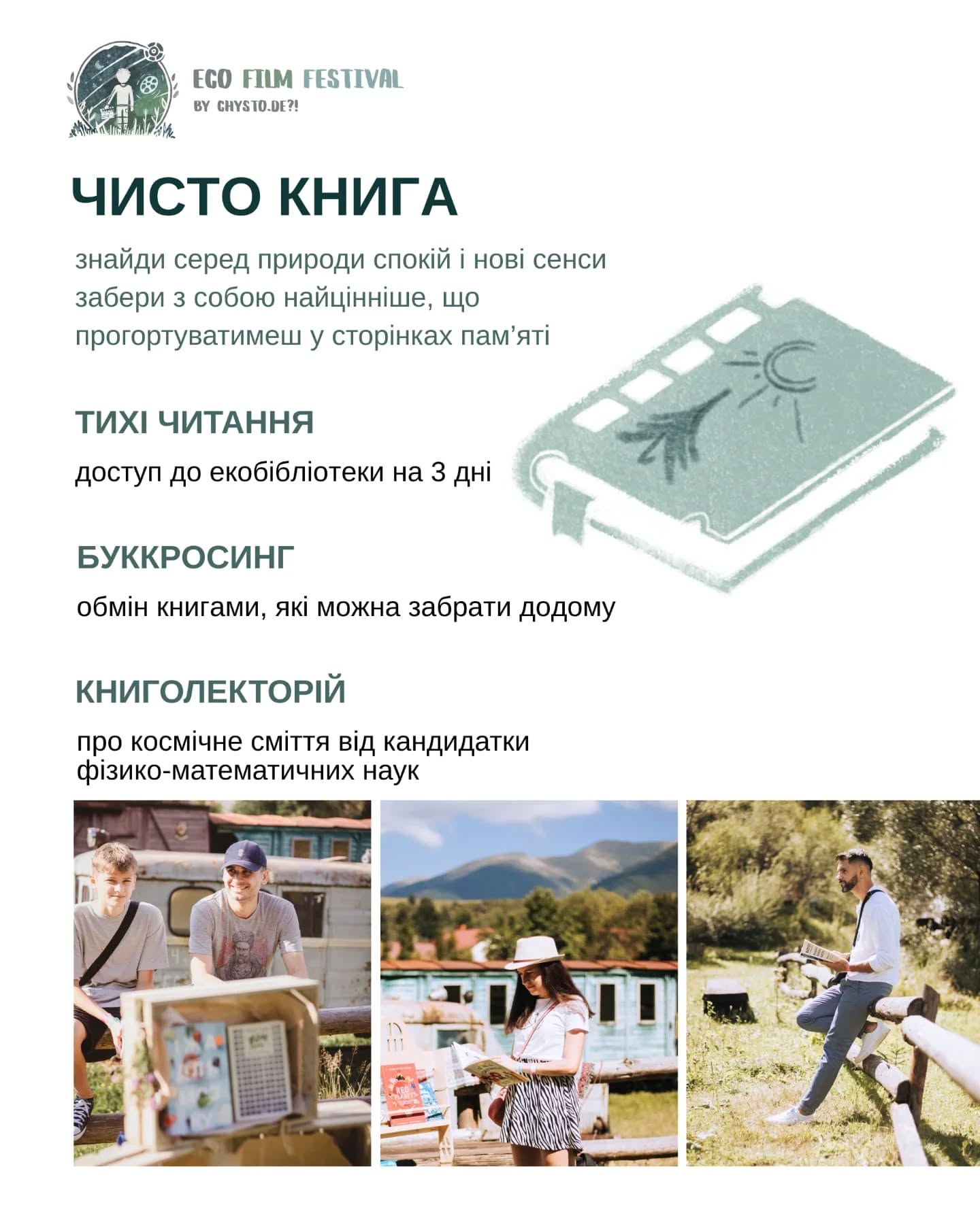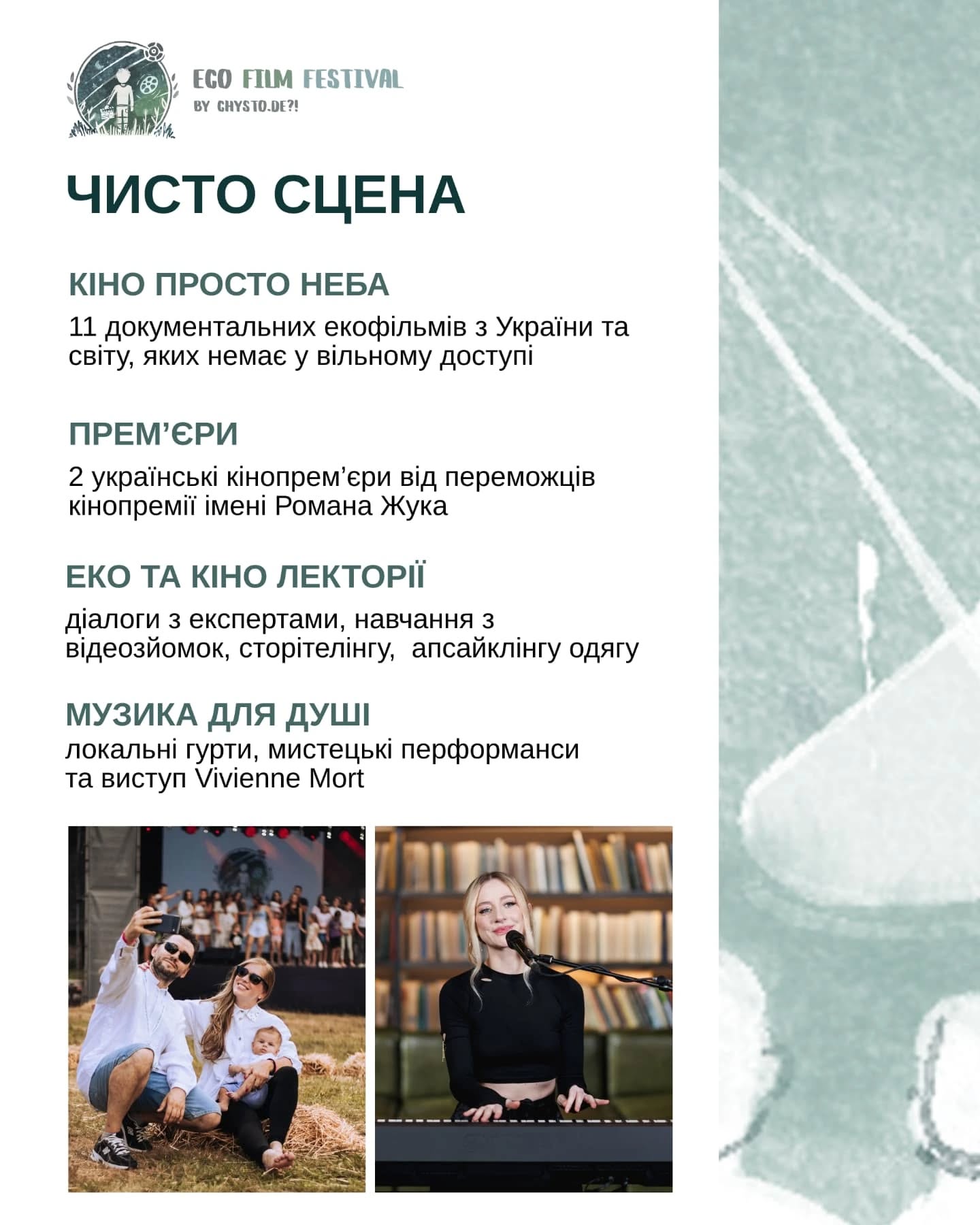 Eco Film Festival by Chysto.de?! — не просто фестиваль. Це екологічна культурно-освітня подія нового формату, яка закохує тебе в історію, у свою країну, в Землю. Але найбільше — в людей. Бо тут ти в оточенні однодумців, яким не все одно.