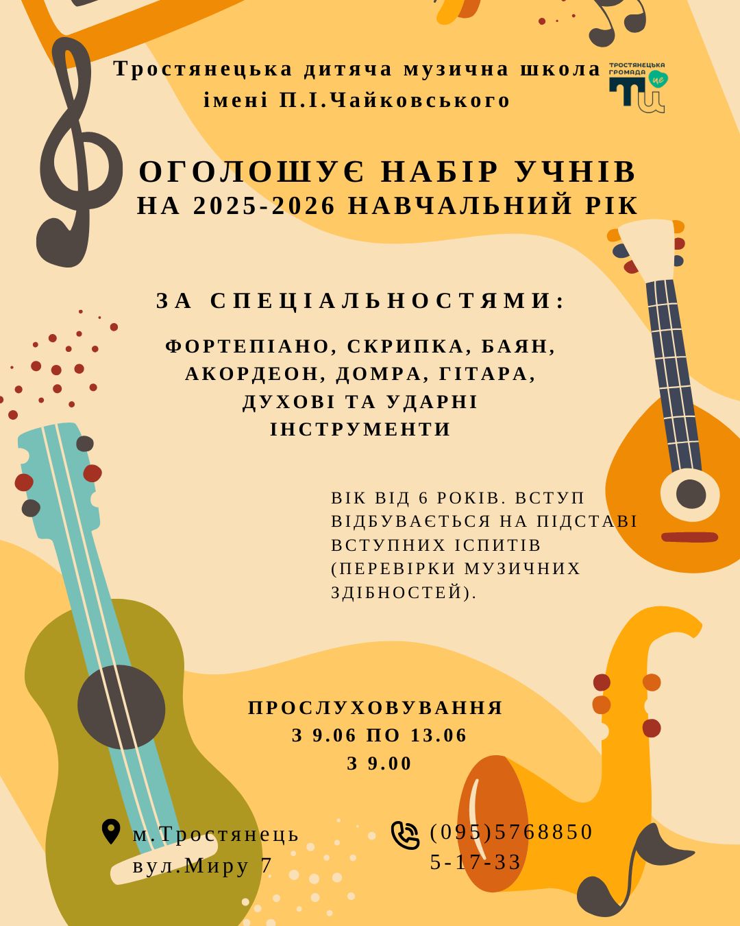 🎶Тростянецька дитяча музична школа оголошує набір учнів на 2025-2026 навчальний рік! Ми запрошуємо юних талантів приєднатися до нашої великої та дружньої музичної родини. Якщо ваша дитина має потяг до музики, мріє навчитися грати на музичних інструментах, не зволікайте, допоможіть їй розвинути свій талант!