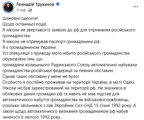 Про це він написав у Facebook. Труханов запевнив, що ніколи не звертався з заявою до РФ для отримання російського громадянства, ніколи не отримував паспорт громадянина РФ і наголосив, що є громадянином України. Ця позиція мера Одеси є важливою для розуміння ситуації навколо його статусу.