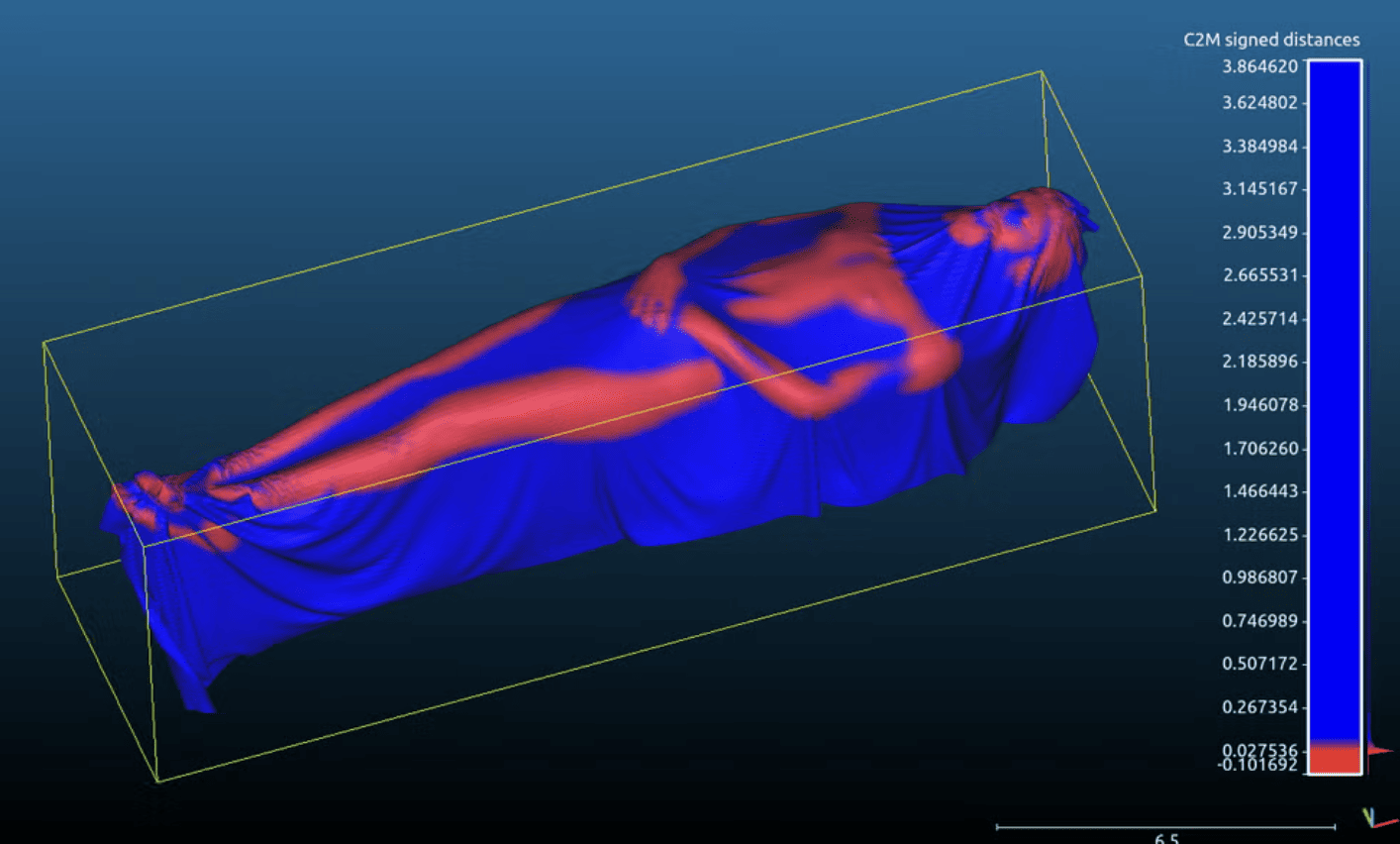 З розвитком сучасних технологій стало можливим проведення більш точних експериментів для перевірки цих аргументів. Бразильський дослідник та 3D-дизайнер Цицеро Мораес відтворив процес створення такого відбитку за допомогою програми з відкритим кодом Blender. Він створив детальну цифрову модель чоловіка віком приблизно 33 роки і наклав на неї віртуальну тканину, щоб імітувати процес залишення відбитку. Результати цього експерименту виявилися показовими: тривимірне тіло, при відтворенні на плоскій поверхні, залишає спотворене та деформоване зображення. Натомість, відбиток на реальній плащаниці виглядає надзвичайно рівним та правильним, що більше схоже на результат, досягнутий за допомогою рельєфної скульптури, ніж на “чудесний слід”.