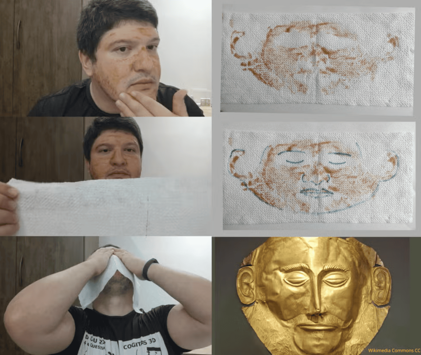 Кадри з відео Мораеса, що демонструють розплющування обличчя на тканині, порівнюючи його зі знаменитими масками похоронних Мікен. / © Popular Mechanics