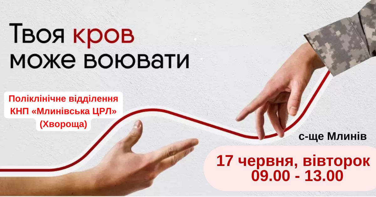Не пропустіть можливість стати частиною великої справи! Чекаємо на вас 17 червня 2025 року з 09:00 до 13:00 у поліклінічному відділенні КНП «Млинівська ЦРЛ» (Хвороща). Разом ми – сила! Разом наближаємо перемогу!🇺🇦