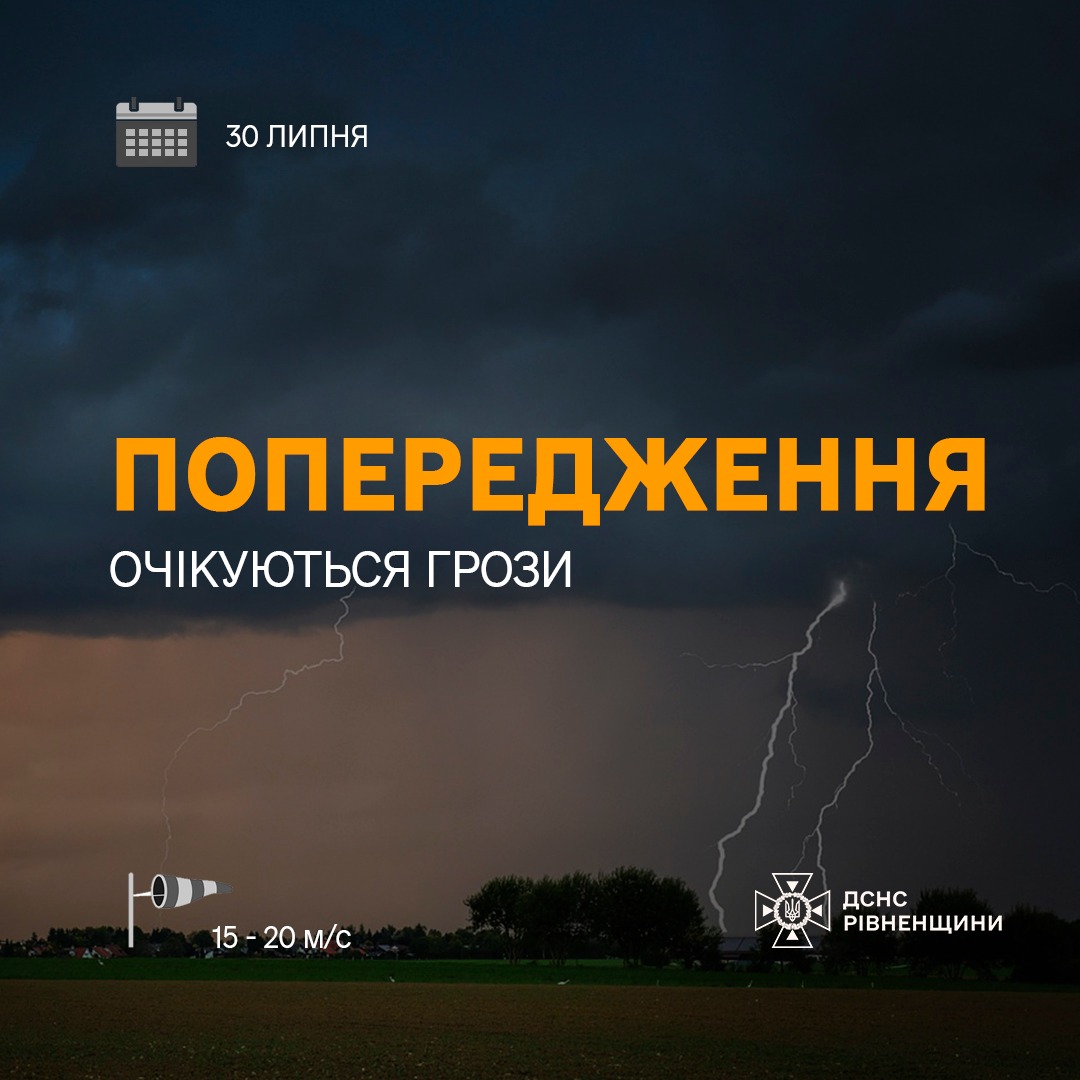 За прогнозами Рівненського обласного центру з гідрометеорології, 30 липня на території Рівненської області та міста Рівне очікуються грози. ⛈ Вдень також прогнозуються пориви північно-західного вітру зі швидкістю 15-20 м/с. Ці погодні умови класифікуються як І рівень небезпечності, що позначається жовтим кольором. 🟡