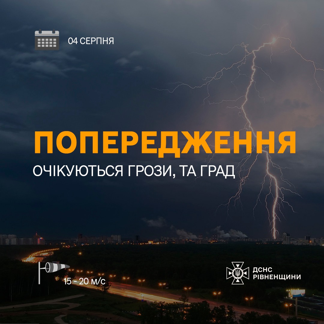 Синоптики попереджають про складні погодні умови 4 серпня на Рівненщині. За інформацією Рівненського обласного центру з гідрометеорології, в цей день очікуються грози, місцями сильні пориви вітру (шквали) зі швидкістю 15-20 м/с, а також град.