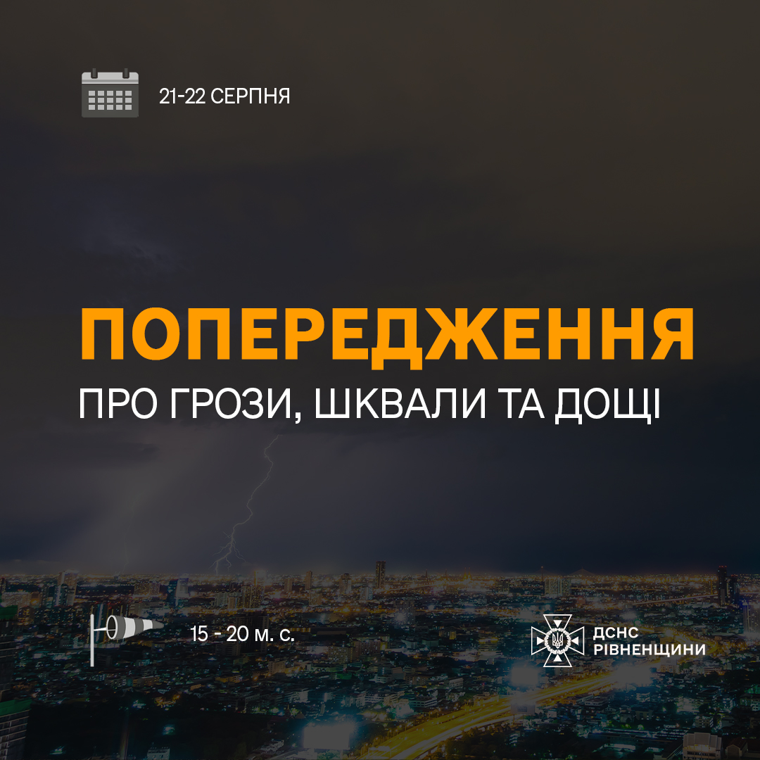 Увага, мешканці Рівненської області! За даними Рівненського обласного центру з гідрометеорології, ввечері 21 серпня та протягом усієї доби 22 серпня на території області очікуються сильні грози. Місцями прогнозується шквалисте посилення вітру, швидкість якого може досягати 15-20 м/с.