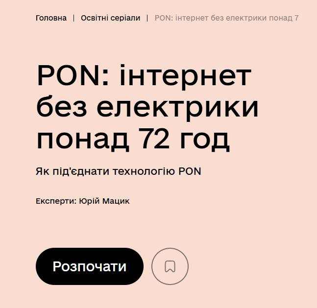 ## Безкоштовний освітній курс: “PON: Інтернет без електрики до 72 годин”