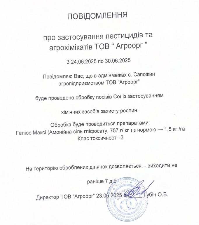 ТОВ «Агроорг» повідомляє про внесення ЗЗР по посівах сої на полях навколо села Сапожин.
