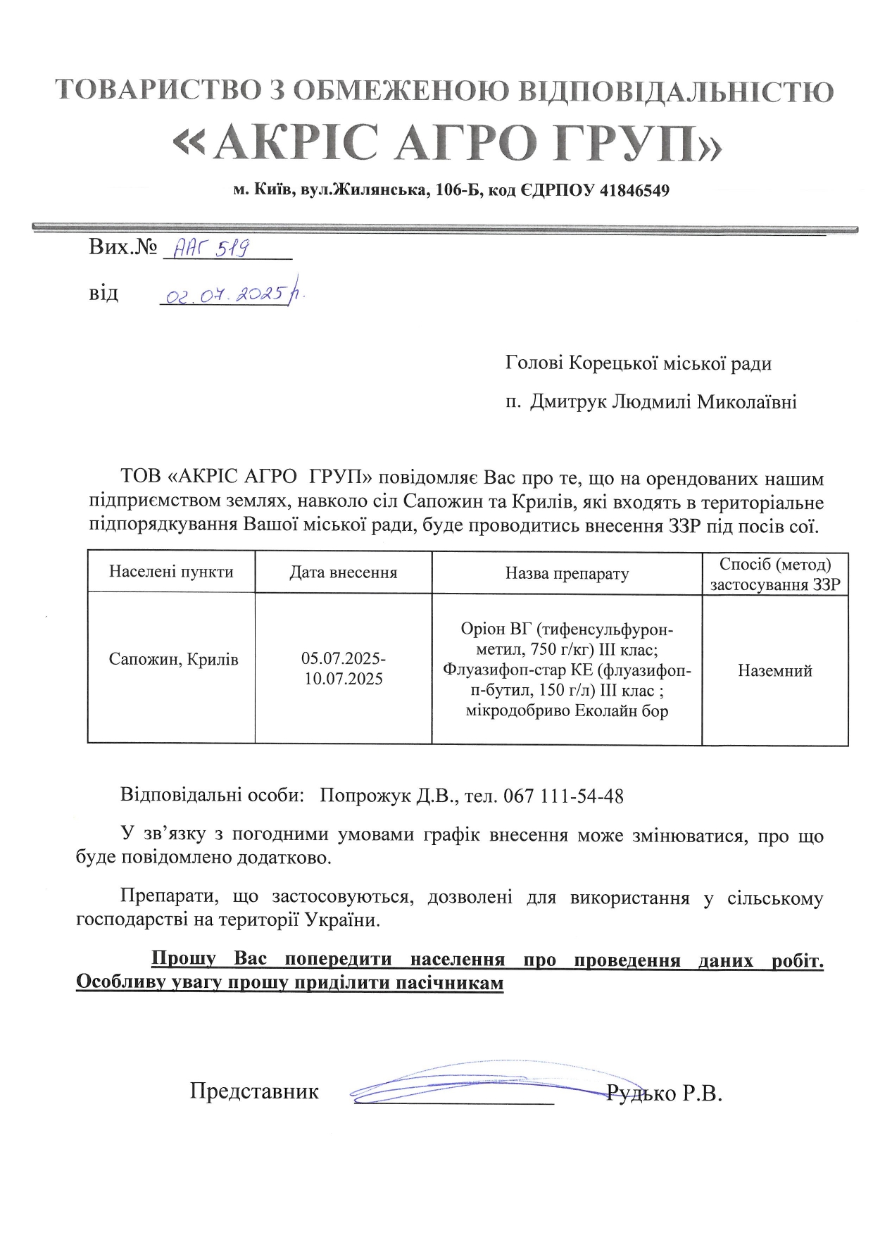 Шановні жителі громад сіл Сапожин та Крилів! З метою забезпечення високих урожаїв сільськогосподарських культур та ефективного захисту рослин від шкідників і хвороб, а також для оптимізації агротехнічних заходів, ТОВ «АКРІС АГРО ГРУП» інформує про проведення планових робіт із внесення засобів захисту рослин (ЗЗР) на посівах сої. Ці важливі агротехнічні заходи є невід’ємною частиною сучасного землеробства, спрямованою на підвищення продуктивності полів та забезпечення продовольчої безпеки нашого регіону. Процес планової обробки полів має надзвичайне значення для збереження врожаю та його якості, адже дозволяє контролювати розвиток бур’янів, шкідливих організмів та різноманітних хвороб, які можуть завдати значної шкоди рослинам. Забезпечення ефективного захисту є ключовим для стабільного аграрного виробництва.