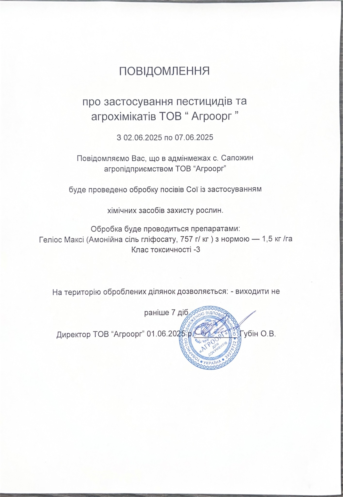 ТОВ «Агроорг» інформує мешканців громади про заплановане внесення засобів захисту рослин (ЗЗР) на посівах сої, розташованих на полях навколо села Сапожин. Обробка проводитиметься в період з 02.06.2025 по 07.06.2025. Це важлива інформація для забезпечення вашої безпеки та збереження здоров’я.