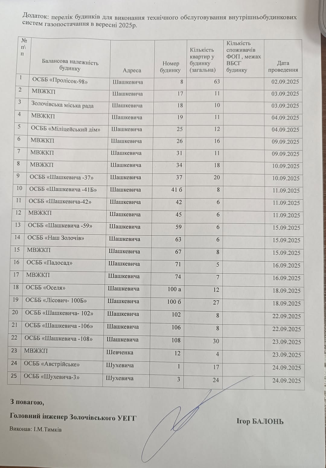 Ознайомитися з детальним графіком та переліком будинків, що підлягають обслуговуванню у вересні 2025 року, можна в офіційному листі, що додається.