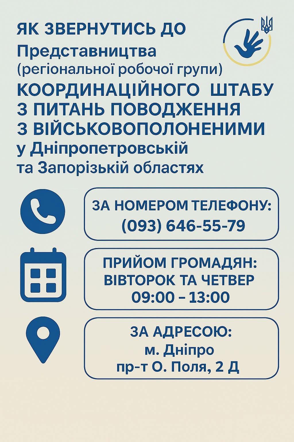 На базі Дніпровського представництва Уповноваженого Верховної Ради України з прав людини працює регіональна робоча група Координаційного штабу з питань поводження з військовополоненими.