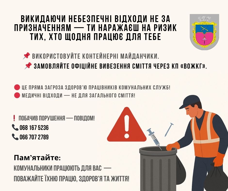 🔴 Увага! Важливе звернення: Бережіть наших комунальників та свою громаду!Нещодавній прикрий інцидент у центрі нашого селища став яскравим нагадуванням про необхідність відповідального ставлення до поводження з відходами. Під час щоденного прибирання центральної площі, працівники нашого комунального підприємства зіткнулися з неприпустимою загрозою. У сміттєвих урнах, призначених для побутових відходів, було виявлено значну кількість використаних шприців та медичних голок. Ця недбалість призвела до серйозних наслідків: один із наших комунальників отримав поранення, виконуючи свої обов’язки. Така ситуація підкреслює критичну важливість правильної утилізації відходів.Такі ситуації виходять за межі простої незручності; вони становлять пряму та серйозну загрозу життю та здоров’ю не лише працівників, але й усіх мешканців громади. Медичні відходи, особливо використані голки та шприци, можуть містити збудники небезпечних інфекційних захворювань, що передаються через кров, таких як ВІЛ, гепатит В та С. Здоров’я та безпека наших комунальників є беззаперечним пріоритетом. Вони щодня дбають про чистоту та порядок у нашій громаді, і ми зобов’язані забезпечити їм максимально безпечні умови праці. Кожен викинутий шприц – це потенційна біологічна зброя, що несе ризик для оточуючих та загрожує загальній безпеці.Ми закликаємо кожного мешканця до свідомості та дотримання елементарних правил поводження з відходами, адже це запорука спільної безпеки та добробуту. Належна утилізація відходів – це не просто правило, це прояв турботи про ближнього.Важливі нагадування та правила поводження з відходами для безпеки громади:☢️ Контейнерні майданчики: У всіх куточках громади встановлені сучасні та доступні спеціалізовані майданчики, призначені виключно для збору твердих побутових відходів. Будь ласка, користуйтеся цими обладнаними місцями для утилізації вашого сміття. Це допомагає підтримувати чистоту та запобігати поширенню небезпечних елементів, забезпечуючи безпеку.📑 Договір на вивезення: Для більшої зручності та відповідальності, кожен охочий завжди може укласти офіційний договір з Комунальним підприємством «ВОЖКГ» на регулярне та безпечне вивезення побутових відходів безпосередньо з вашого домогосподарства. Це не лише доступна, але й найнадійніша та найбезпечніша альтернатива для цивілізованого вирішення питання утилізації сміття. Зверніться до КП «ВОЖКГ» для отримання детальної інформації щодо послуг з вивезення та утилізації.🎥 Відповідальність та контроль – запорука порядку:• Відеоспостереження: Для забезпечення громадського порядку та контролю за дотриманням правил благоустрою, у центральній частині селища та на інших ключових об’єктах встановлені сучасні камери відеоспостереження. Вони постійно фіксують усі порушення, що відбуваються у громадських місцях, забезпечуючи додаткову безпеку.• Адміністративна відповідальність: Хочемо нагадати, що самовільне викидання сміття у невстановлених місцях, а також грубе порушення правил поводження з небезпечними відходами (до яких відносяться і медичні інструменти), тягне за собою сувору адміністративну відповідальність згідно з чинним законодавством України. Це включає значні штрафи та інші заходи впливу за неналежну утилізацію.Ваша допомога важлив