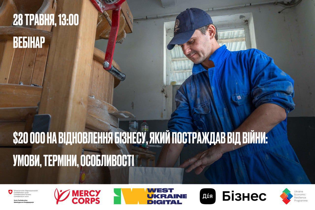 Запрошуємо представників місцевого бізнесу на вебінар, присвячений можливостям отримання фінансової підтримки для відновлення та розвитку! Міжнародна гуманітарна організація Mercy Corps у партнерстві з West Ukraine Digital оголошує про третю фазу Програми підтримки економічної стійкості України. Ця програма орієнтована на малий та середній бізнес, що постраждав від війни, та має на меті створення або збереження робочих місць, зокрема для ВПО та постраждалих громадян. Шукаєте можливість для відновлення бізнесу? Цей вебінар для вас!