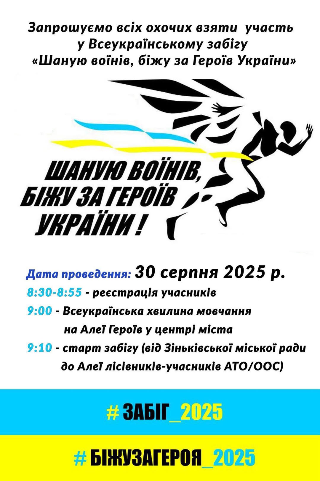 🗓 Подія відбудеться 30 серпня 2025 року. Цей день стане особливим для міста Зіньків, адже саме тут, за адресою вул. Воздвиженська, 40 (біля міської ради), о 08:30 розпочнеться реєстрація учасників. О 09:00 вшануємо пам’ять полеглих героїв хвилиною мовчання на Алеї Героїв, а вже о 09:10 пролунає стартовий сигнал для учасників забігу.