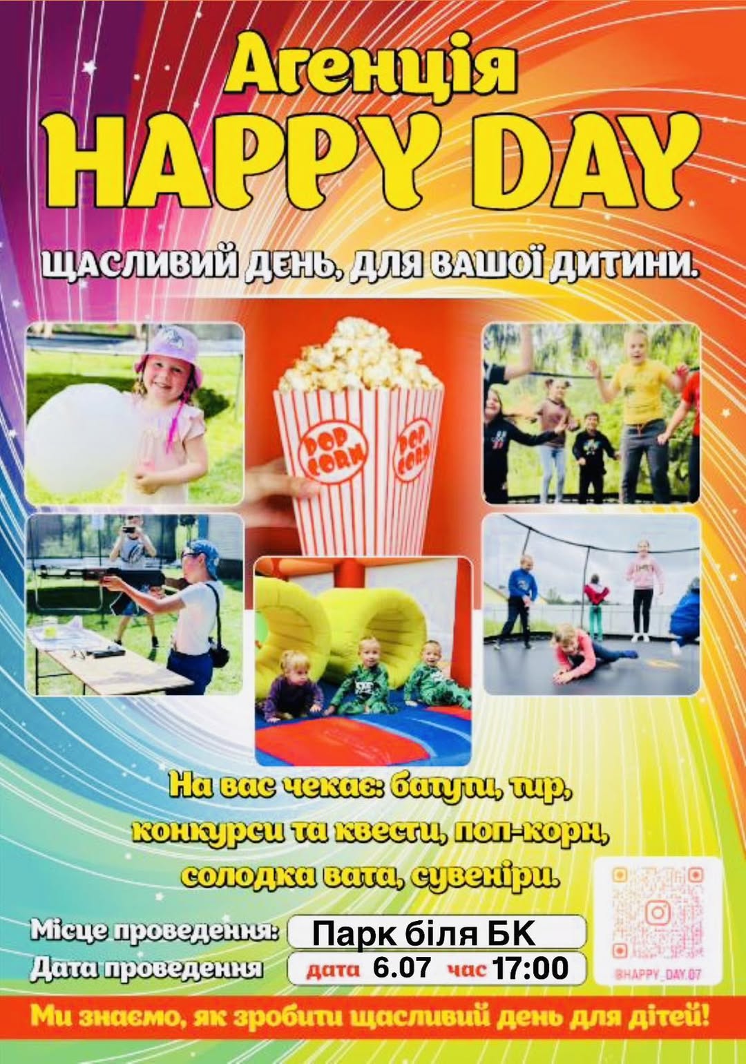 Шановні мешканці та гості Віньковець, готуйтеся до незабутнього дня, сповненого радості та веселощів! Агенція “HAPPY DAY” запрошує вас на велике дитяче свято у Віньківцях, що відбудеться вже цієї неділі, 6 липня, о 17:00. Це чудова нагода провести час із сім’єю, подарувати дітям щирі посмішки та водночас зробити добру справу, адже частина коштів від заходу буде передана на підтримку Збройних Сил України.Ми ретельно підготували програму, яка задовольнить найвибагливіших маленьких гостей. На Ваших діток чекає справжнє розмаїття атракціонів та смаколиків, що перетворить цей день на справжню казку. Головною зіркою свята, безумовно, стануть батути, де енергія маленьких стрибунців буде нестримною! Це ідеальне місце для активних ігор та виплескування емоцій у безпечному середовищі. Наші батути доступні за ціною 150 грн, і що найприємніше – це безлімітне користування протягом трьох годин, що гарантує максимальне задоволення від кожного стрибка.Окрім активних розваг, на святі буде безліч гастрономічних сюрпризів. Хіба можна уявити дитяче свято без солодкої вати та ароматного поп-корну? Ці невід’ємні атрибути дитинства чекатимуть на вас: солодка вата всього за 50 грн, а смачний поп-корн – за 60 грн. Це прекрасний спосіб насолодитися моментом та створити атмосферу справжнього свята. Для тих, хто полюбляє точність та влучність, працюватиме тир, де можна перевірити свої навички та виграти призи, а коштує це задоволення лише 10 грн за спробу.Також на святі будуть доступні різноманітні сувеніри, які стануть приємними спогадами про цей чудовий день. Ціни на сувеніри стартують від 10 грн, дозволяючи кожній дитині знайти щось до душі та взяти з собою частинку цієї незабутньої атмосфери. Агенція “HAPPY DAY” дбає про кожну деталь, щоб розваги для дітей були максимально цікавими та безпечними. Ми прагнемо створити простір, де діти зможуть вільно веселитися, сміятися та знайомитися з новими друзями.Цей захід – це не просто дитяче свято; це ініціатива, яка об’єднує громаду Віньковець навколо важливої мети. Кожен придбаний квиток на батути, кожна порція солодкої вати чи поп-корну, кожна спроба у тирі та кожен сувенір стануть вашим особистим внеском у велику справу – підтримку українських захисників. Ми віримо, що спільними зусиллями можемо зробити значний внесок у нашу спільну перемогу. Приходьте всією родиною, насолоджуйтесь кожною миттю та даруйте радість собі та своїм дітям, розуміючи, що ваша участь має величезне значення.Не пропустіть нагоду створити незабутні спогади та підтримати важливу справу. Агенція “HAPPY DAY” знає, як зробити день вашої дитини по-справжньому щасливим! Чекаємо на вас 6 липня о 17:00 у Віньківцях, щоб разом відсвяткувати радість дитинства та проявити єдність. Ваші діти заслуговують на найкращі емоції, а наші захисники – на нашу unwavering підтримку. Приєднуйтесь до нас для яскравих вражень та благородної місії!