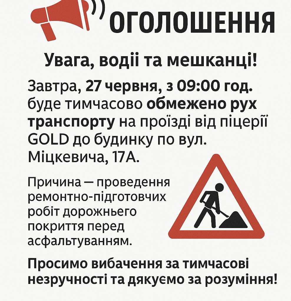 Шановні водії та мешканці міста! Звертаємо вашу увагу на важливу інформацію щодо тимчасового обмеження руху транспорту, яке буде запроваджено завтра, 27 червня. Ці заходи необхідні для проведення масштабних ремонтно-підготовчих робіт дорожнього покриття, що є критично важливим етапом перед подальшим асфальтуванням ділянки.Обмеження руху діятиме з 09:00 години ранку на проїзді, що сполучає піцерію GOLD та будинок за адресою вул. Міцкевича, 17А. Ця ділянка дороги вимагає особливої уваги, оскільки якість дорожнього покриття безпосередньо впливає на безпеку та комфорт усіх учасників дорожнього руху. Проведення таких робіт є запорукою довговічності нового асфальту та зниження ризиків виникнення аварійних ситуацій.Ми розуміємо, що тимчасове обмеження руху може спричинити певні незручності для мешканців та водіїв, які регулярно користуються цим маршрутом. Тому заздалегідь просимо вибачення та закликаємо планувати свої поїздки, враховуючи ці зміни. Рекомендуємо використовувати альтернативні маршрути або, за можливості, обирати громадський транспорт на період проведення робіт.Основна причина впровадження цих обмежень – необхідність ретельної підготовки основи дорожнього покриття. Це включає в себе усунення дефектів, вирівнювання поверхні та забезпечення належного дренажу. Без цих підготовчих етапів, навіть найякісніший асфальт не зможе витримати інтенсивний транспортний потік та швидко зруйнується. Інвестиції у якісний ремонт дороги – це інвестиції у безпеку та комфорт нашого міста.Місцеві служби докладають усіх зусиль, щоб завершити ремонтні роботи якнайшвидше та відновити повноцінний рух транспорту на вул. Міцкевича. Ваше розуміння та терпіння допоможуть прискорити процес та забезпечити високу якість виконаних робіт. Слідкуйте за оновленнями інформації щодо відновлення руху.Ми вдячні вам за співпрацю та розуміння важливості цих заходів для покращення міської інфраструктури та підвищення безпеки дорожнього руху на вул. Міцкевича. Завдяки вашій обізнаності та відповідальному ставленню, ми зможемо мінімізувати вплив тимчасових незручностей на щоденне життя міста.Будь ласка, врахуйте інформацію про обмеження руху на вул. Міцкевича 27 червня з 09:00.