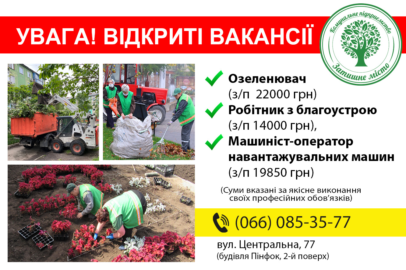 Ми пропонуємо цікаву роботу, де кожен може знайти своє місце та зробити вагомий внесок у розвиток нашого міста. Наші двері завжди відкриті для відповідальних та працьовитих людей, які готові працювати на благо громади.