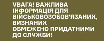 УВАГА! Громадяни, обмежено придатні до військової служби, повинні пройти повторний медогляд до 5 червня 2025 року. Відповідно до Закону України № 4235-IX від 12 лютого 2025 року, ця вимога стосується громадян України віком від 25 до 60 років, які раніше отримали статус обмежено придатних. Важливо зауважити, що це не стосується осіб, які офіційно визнані особами з інвалідністю.