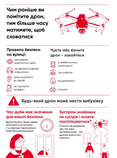 👁🗨 Будьте пильні: частіше дивіться на небо, щоб своєчасно помітити потенційну небезпеку. Не носіть навушники під час перебування на вулиці, оскільки це може завадити вам почути звук наближення дрона. Уникайте відволікань на телефон, особливо в місцях, де може виникнути небезпека. Якщо ви чуєте чи бачите дрон, негайно сховайтесь у найближче безпечне місце: це може бути приміщення, під навіс, за дерево або в густі кущі. Пам’ятайте, що укриття значно підвищує ваші шанси на безпеку.