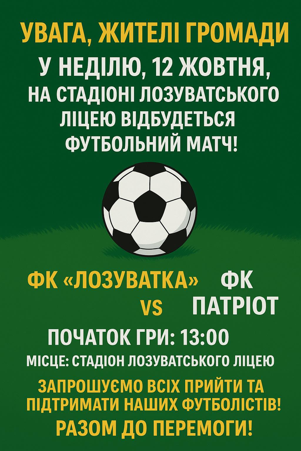 У неділю, 12 жовтня, стадіон Лозуватського ліцею стане ареною для справжнього футбольного протистояння. Місцеві команди ФК «Лозуватка» та ФК «Патріот» зійдуться у поєдинку, який обіцяє бути напруженим та видовищним. Ця гра є чудовою нагодою для жителів громади зібратися разом та підтримати своїх улюблених спортсменів.